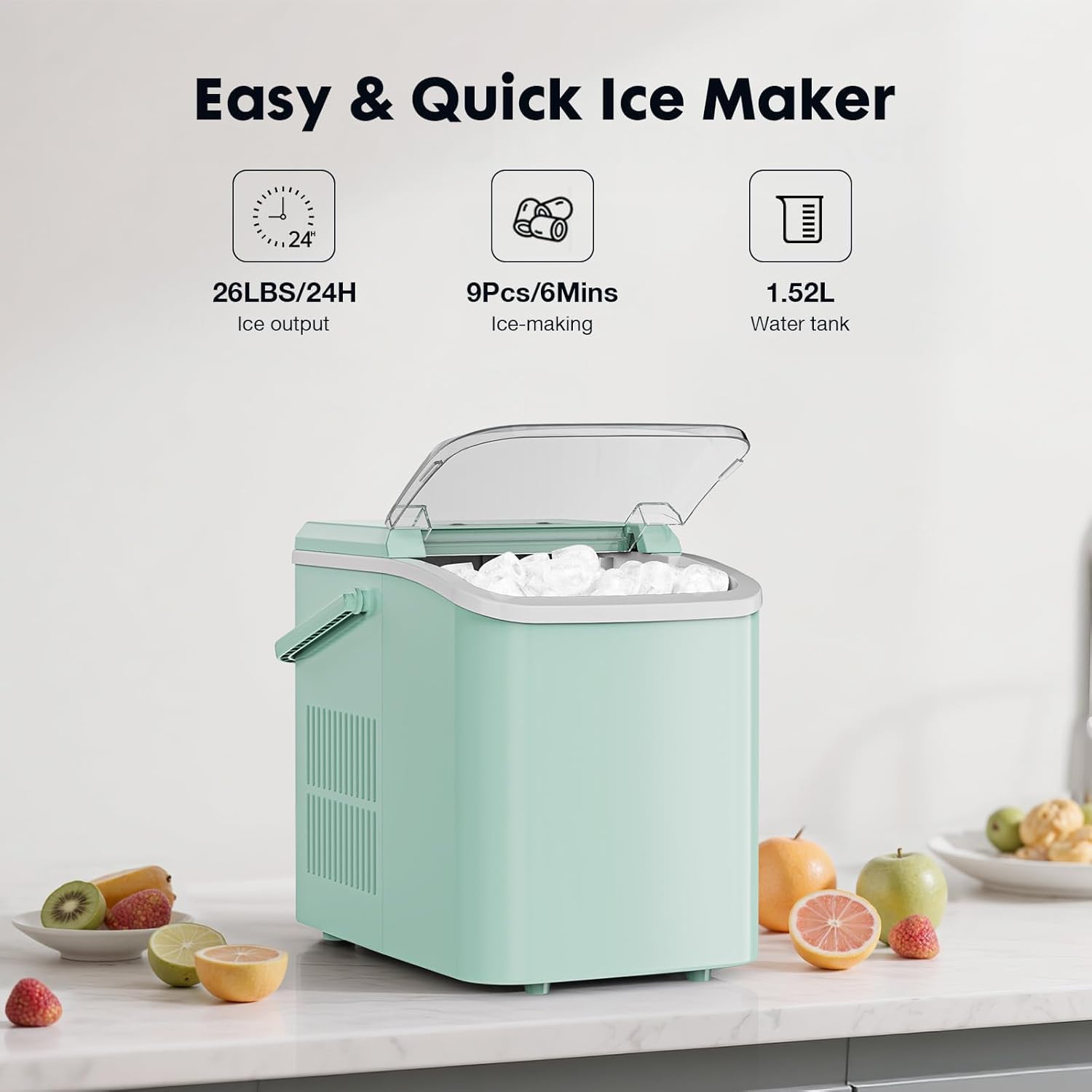【FAST ICE MAKING】The ice maker can make 9 bullet-shaped ice cubes in just 6 minutes. Fill 1.5L of water into the water tank, maximum ice capacity can reach 26.5 pounds in 24 hours. Say goodbye to long waiting times and enjoy a constant supply of ice whenever you need it. It has a transparent window, so you can watch the ice being made.