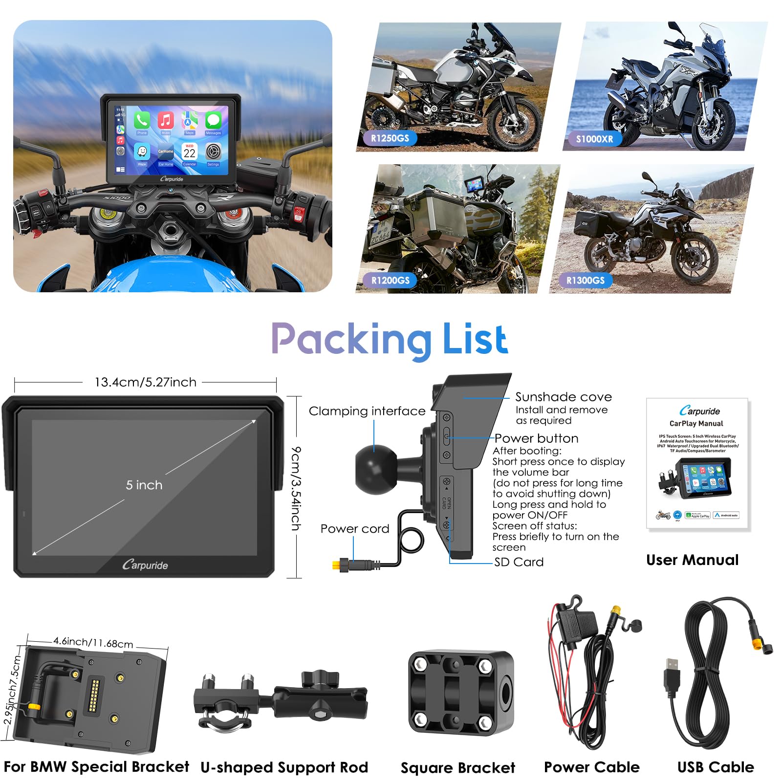 【Wireless CarPlay & Android Auto for BMW Motorcycles】The Carpuride W502B Pro motorcycle CarPlay Screen offers CarPlay and Android Auto functionality. By wirelessly connecting your smartphone to your motorcycle's touchscreen via Bluetooth, you can easily access map navigation, phone calls, music playback, text messaging, and more with the assistance of Siri or Google Assistant. Note: It is only compatible with iOS 6+ and Android 11+.