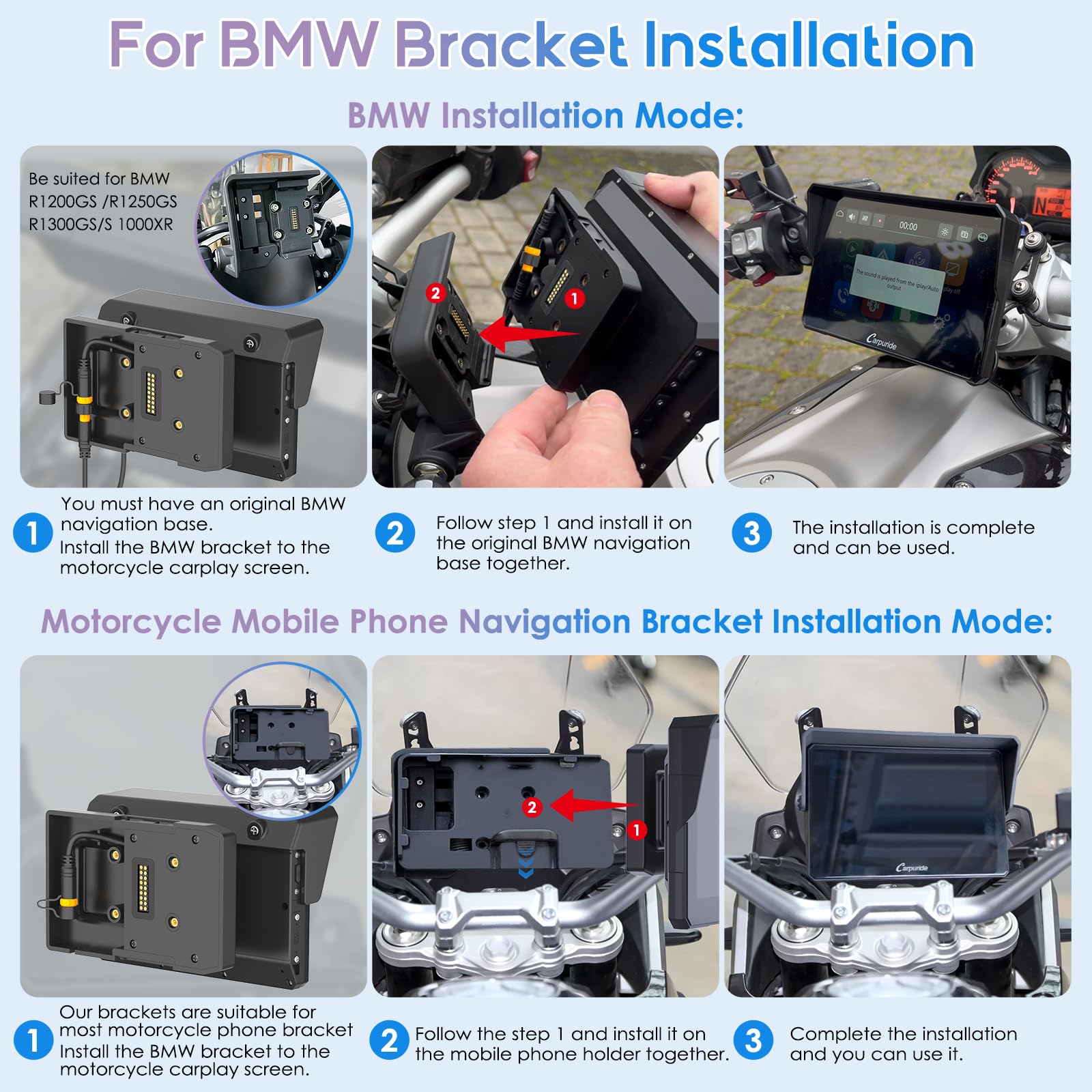 【Custom Mount for BMW Motorcycles】: The W502b motorcycle CarPlay screen includes a tailored bracket kit and specialized tools for BMW motorcycles, ensuring effortless installation. The custom bracket kit and secure screw system provide a stable setup for mounting the screen on your R1200GS, R1250GS, S1000XR or R1300GS motorcycle. Please note: you must possess the original navigation base for BMW Motorcycles to utilize this product.