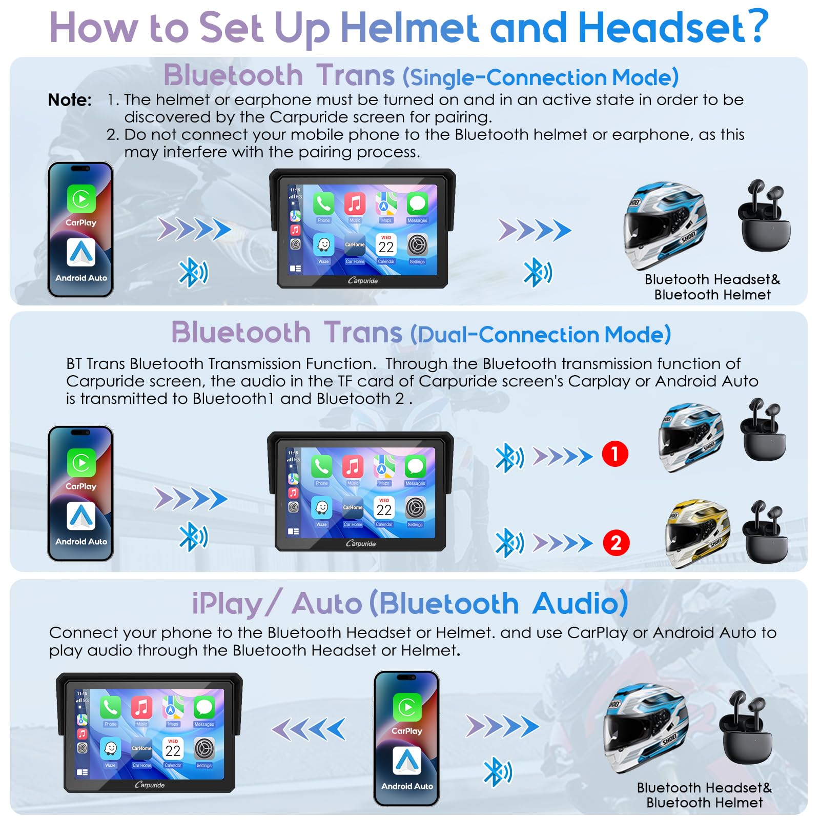 【Single & Dual Connection Modes】In BT Trans mode, the W502B PROCarPlay supports both single and dual connections, allowing you to pair Bluetooth headsets or helmets with ease, whether for solo use or sharing with a passenger. In CarPlay or Android Auto mode, only single connection is supported, enabling audio transmission from your smartphone to a helmet or headset for hands-free communication and music playback.