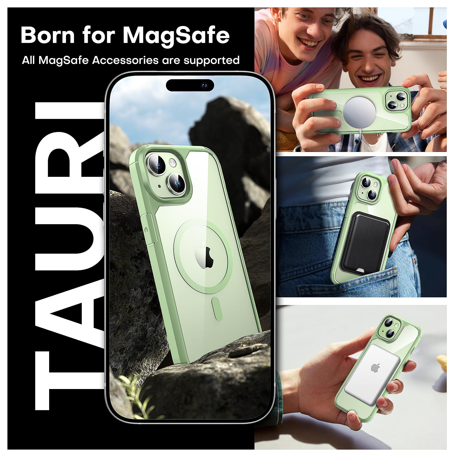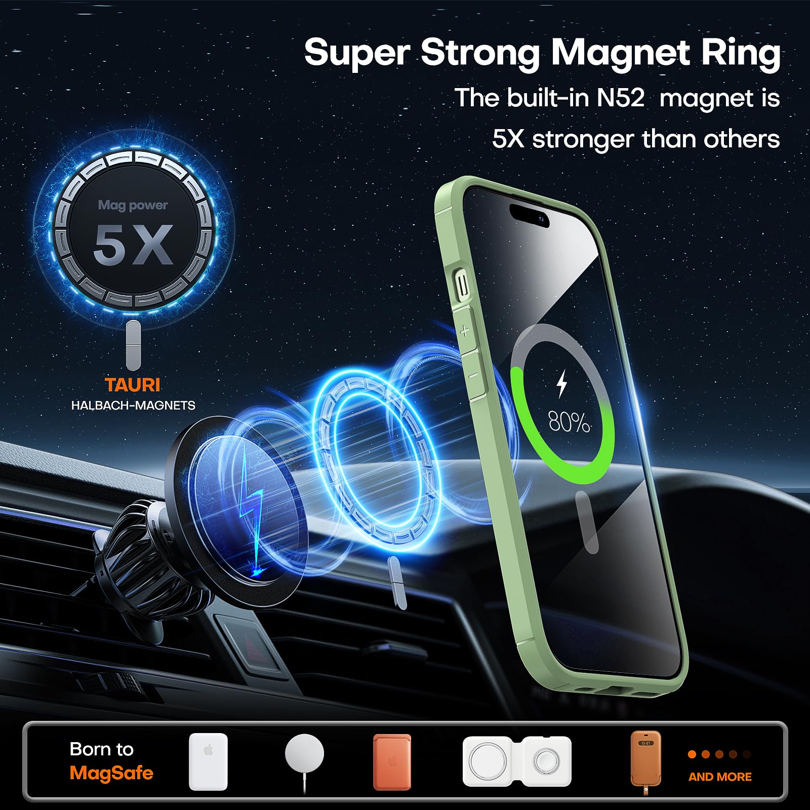 【Super Magnetic Attraction】TAURI for iPhone 15 Case is embedded with 38 N52 magnets, boasting a magnetic attraction strength of up to 18N. Compared to the official magnetic case, its magnetic strength is increased by more than 50%. Moreover, it is compatible with all magnetic accessories and third-party Qi-certified wireless chargers, ensuring faster and easier charging. Let you enjoy a smarter and more effortless living experience