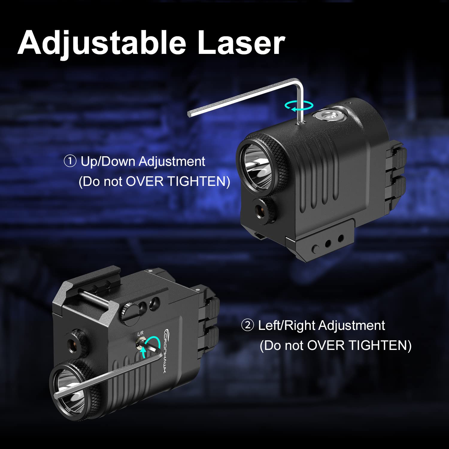 Safe Pistol Laser Light Combo: The output of the red laser is <5 mW, Class IIIa, the pistol light laser combo have two holes L/R and U/D to adjust the laser location with the included Allen wrench