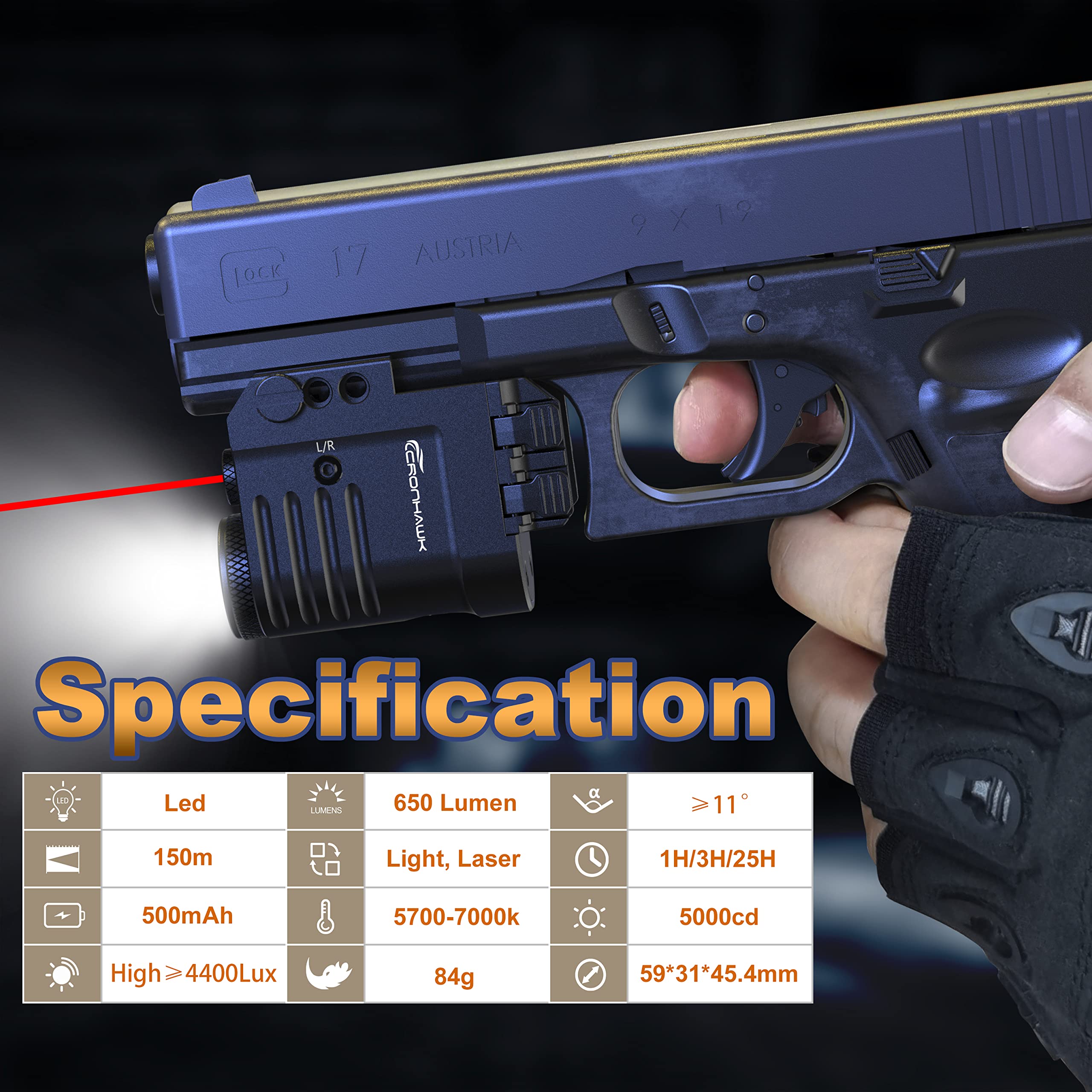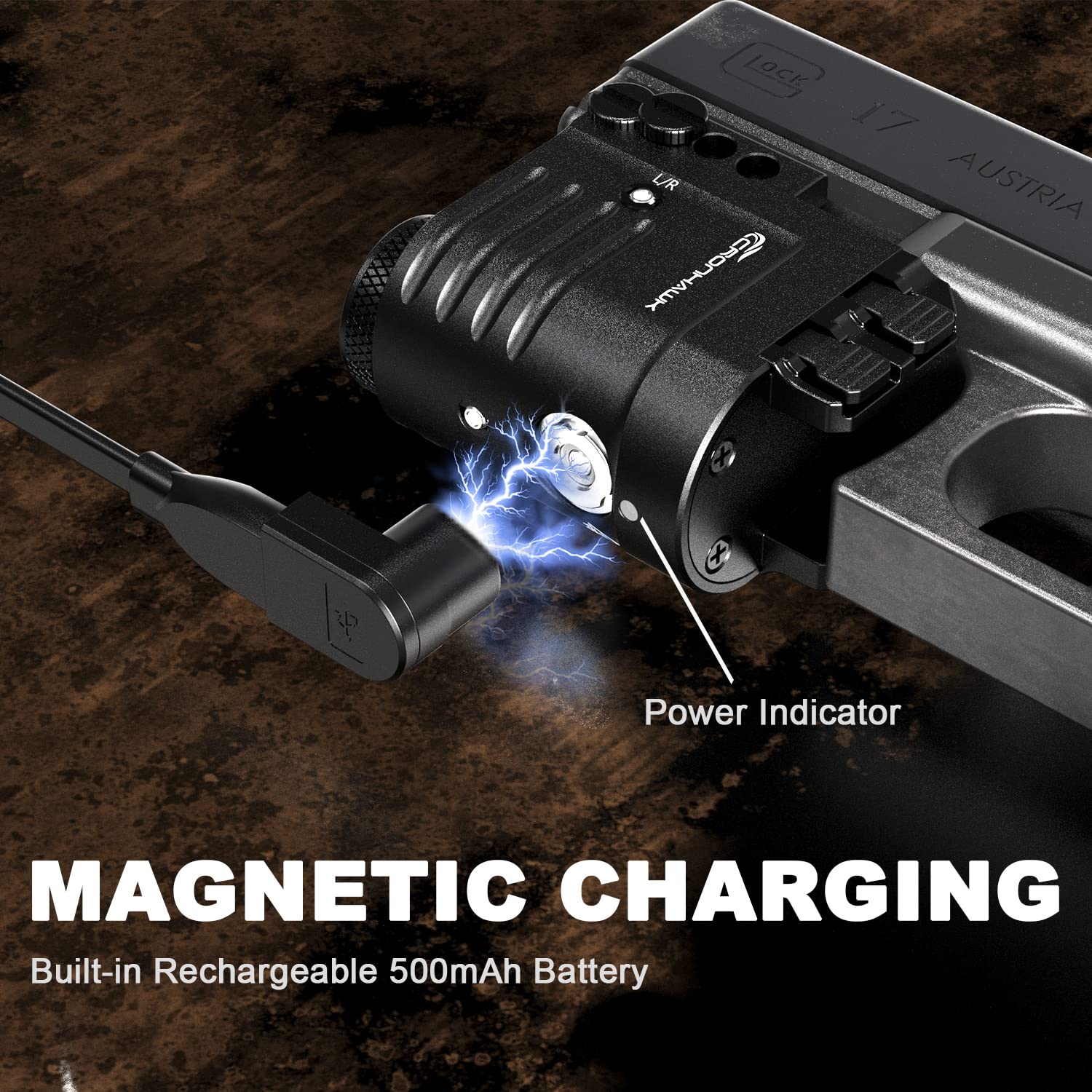 Rechargeable Pistol Light: The gun flashlight with red laser has a built-in battery recharges with included magnetic charging cable