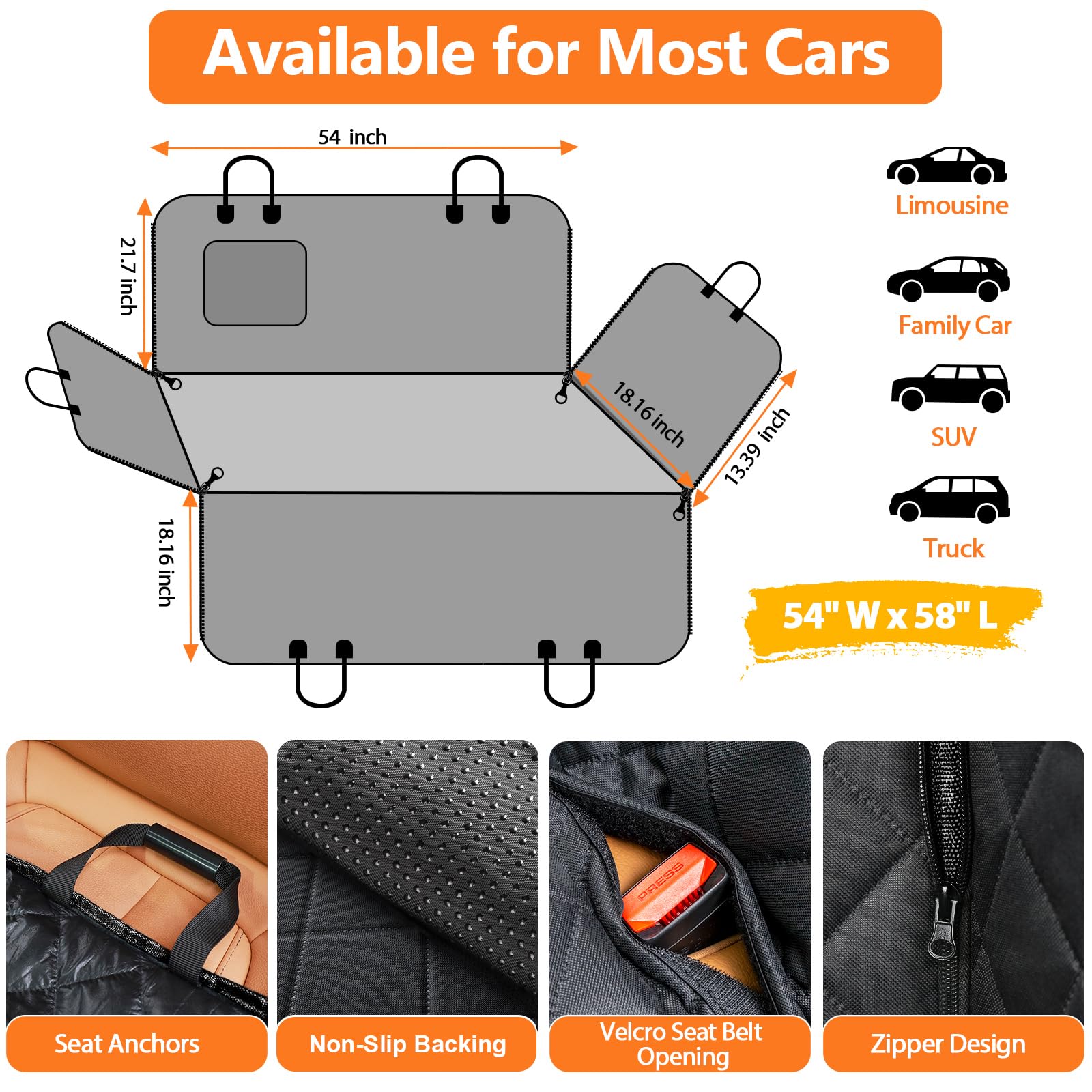 EXCELLENT SIZE - 54" W x 58” L (Maximum open size) can cover the entire back seat for ultimate protection and hassle-free rides, Designed for most cars, trucks and SUVs. Now you can enjoy family excursions without damaging your car!