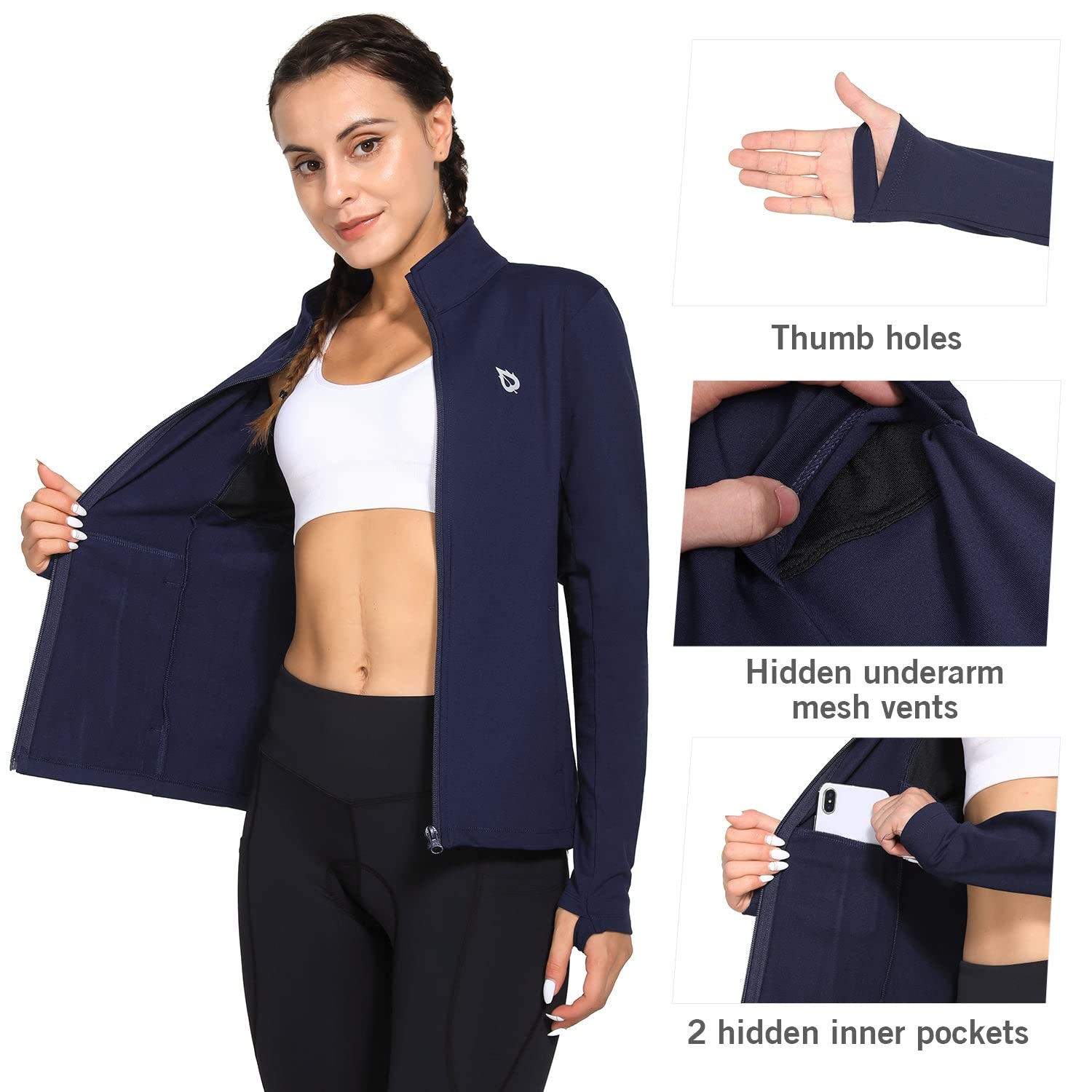 Thumb Holes: These women's running jackets are designed with a high collar and thumbholes to help keep your sleeves down and guard against wind chill. Hidden underarm mesh vents provide ventilation and prevent overheating