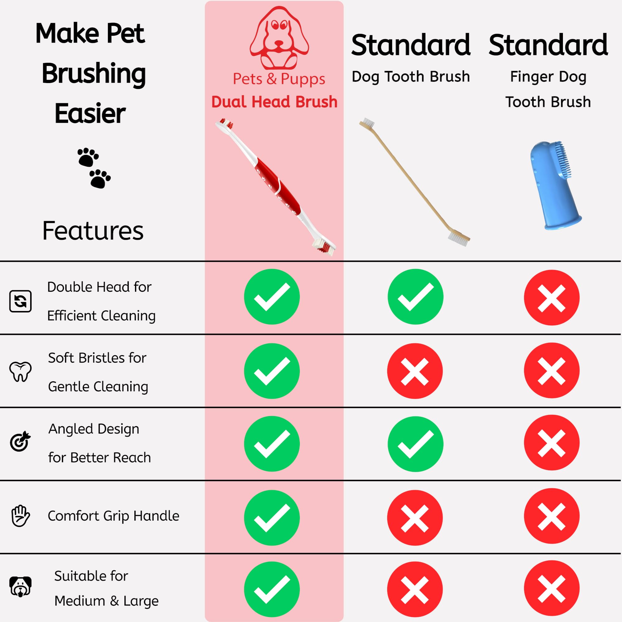 Unique Patent Design: No need to buy separate toothbrushes for medium and large dogs. This innovative dual-head puppy toothbrush with optimized length is specially designed with two different sized heads to accommodate pets over 12 lbs.