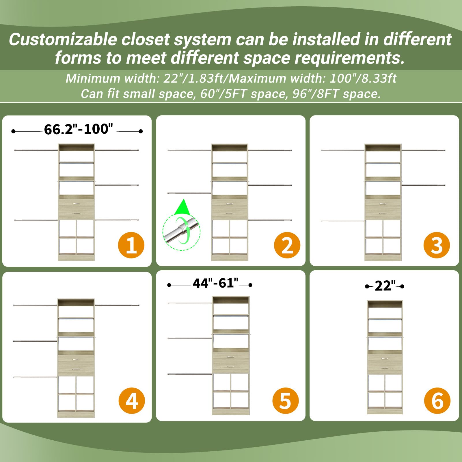 【Expandable Hanging Rods for Flexible Installation】Designed with adjustable hanging rods that extend from 22” to 39.4”, this closet system easily adapts to closet spaces of various widths. Customize the rod positions based on room/closet length or clothing volume, giving you the flexibility to hang suits, dresses, or coats wherever needed