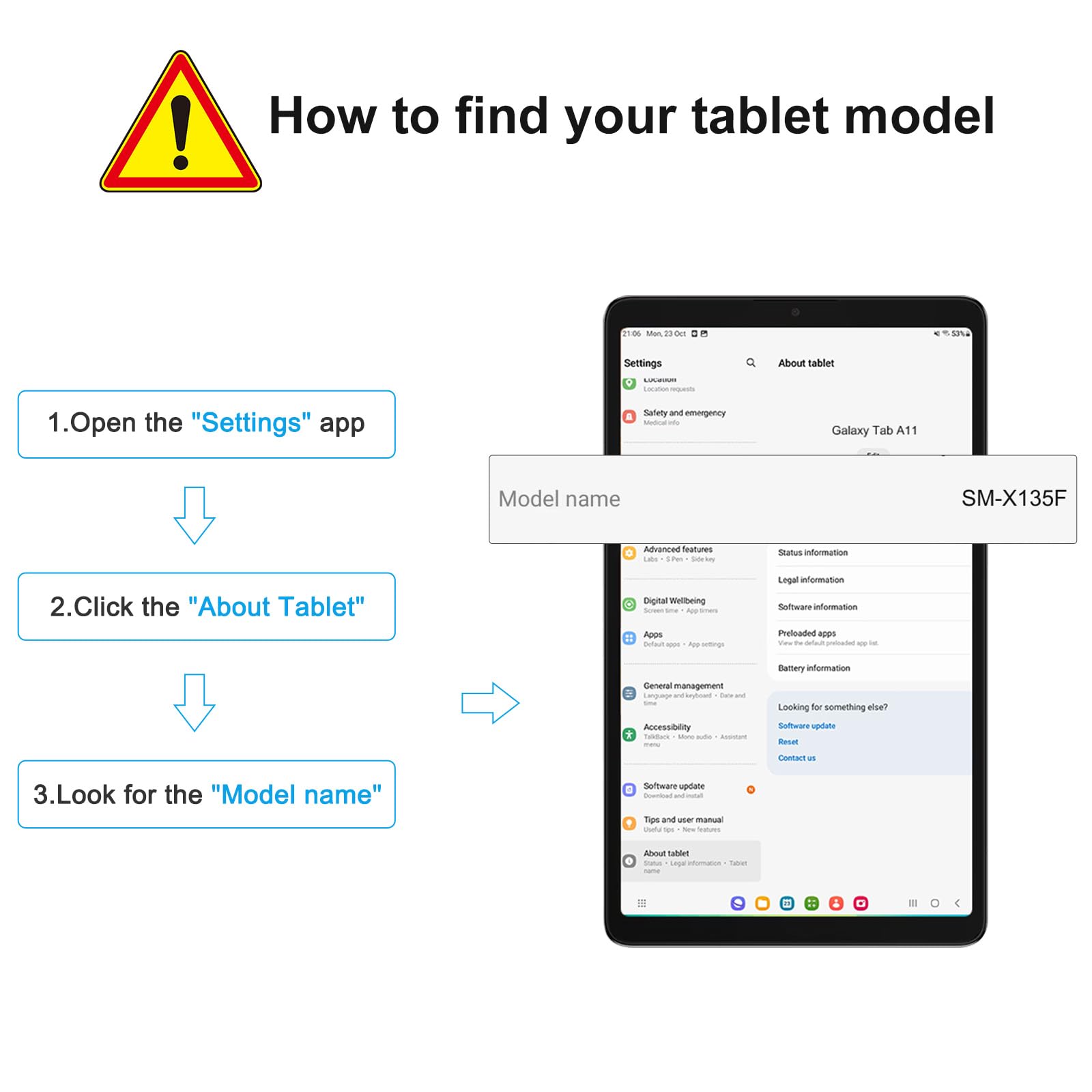 Attention: Please ensure your tablet is Samsung Tab a9 & a11 8.7 inch (SM-X133/X135/X110/X115). Before placing order, click the “Setting”--“About Tablet” then you can know what your tablet is