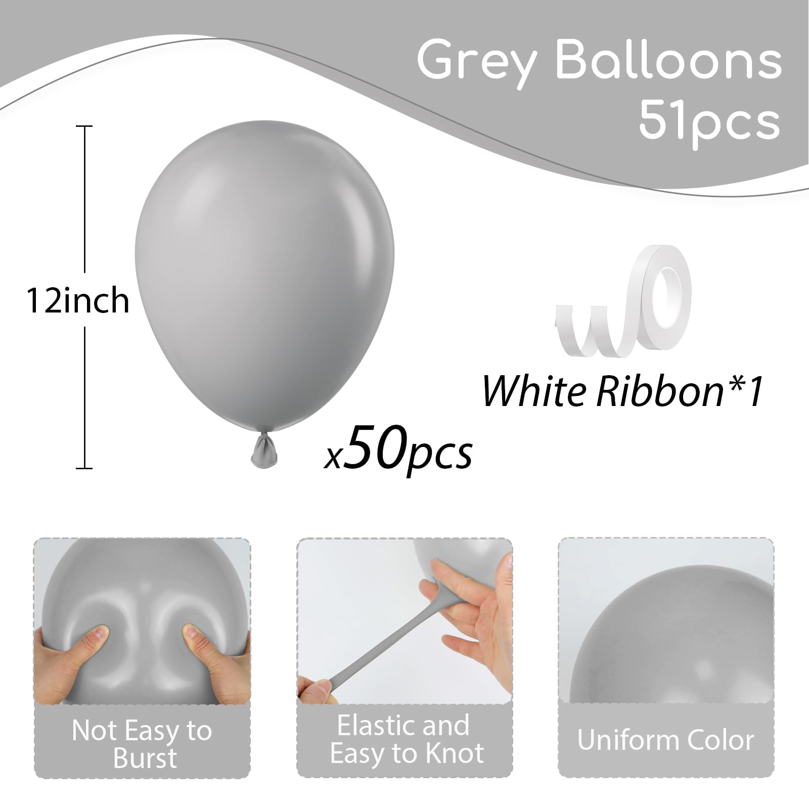 Package Include: The package include 50pack 12 inch gray balloons and a roll of 33 feet white ribbon