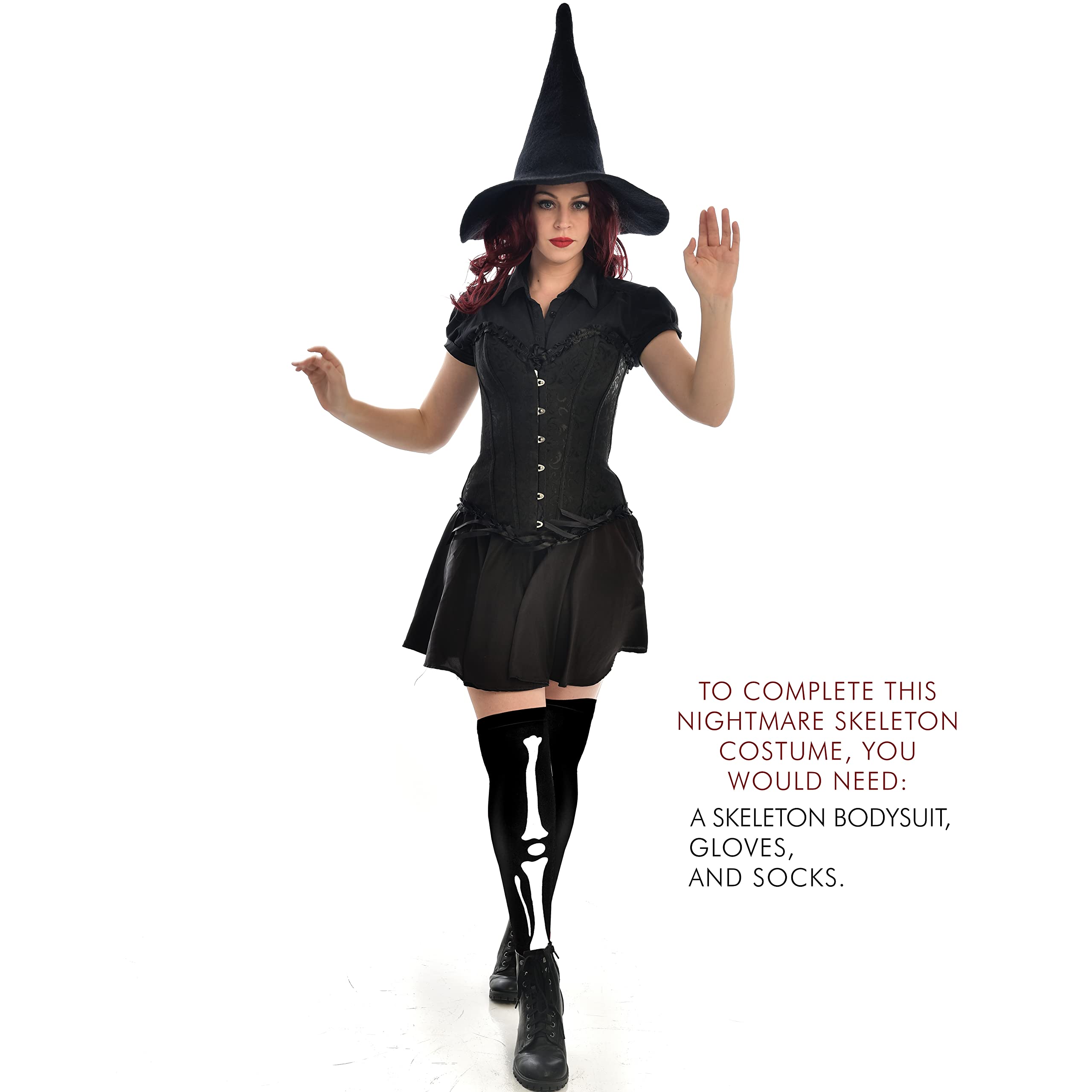 To complete this nightmare skeleton costume, you would need a skeleton bodysuit, gloves, and socks.