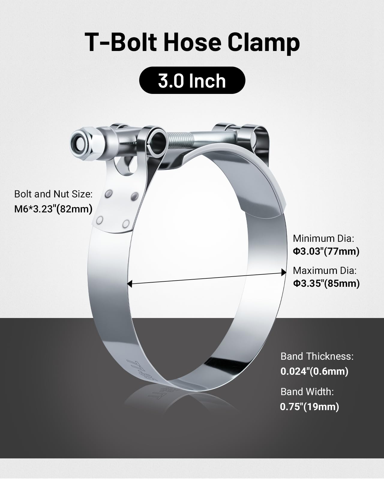 Clamp Size: This is a 3 in T-bolt hose clamp with an adjustable working range of 3.03–3.35 in (77 mm to 85 mm). Width: 0.75 in (19 mm). Thickness: 0.6 mm (0.024 in). Bolt thread size: M6×82 mm (3.23 in).
