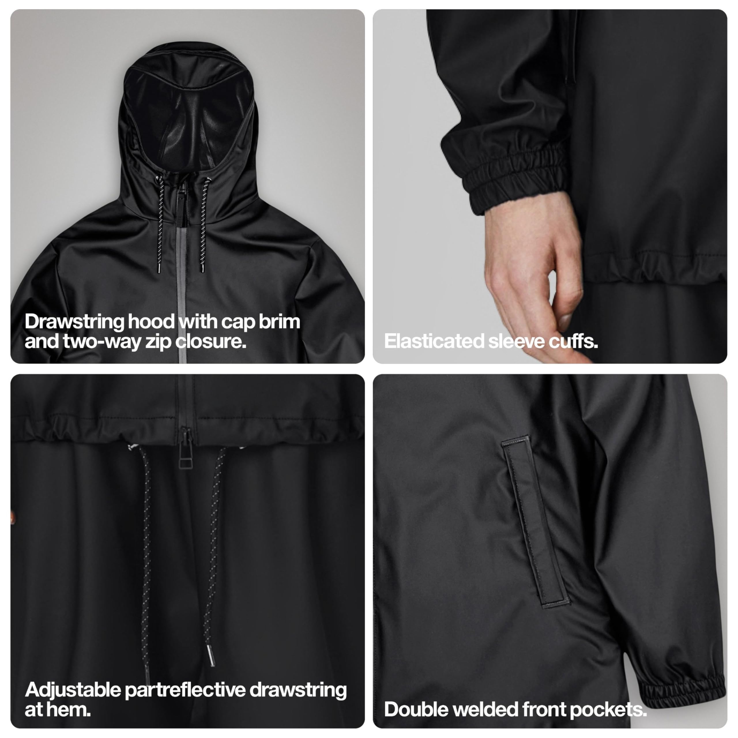 RAINS SIGNATURE DESIGN: This waterproof jacket is detailed with double welded front pockets, elasticated cuffs, and a smooth finish that enhances comfort. Designed for function with a clean silhouette, the construction aligns with RAINS’ neo-Scandinavian identity.