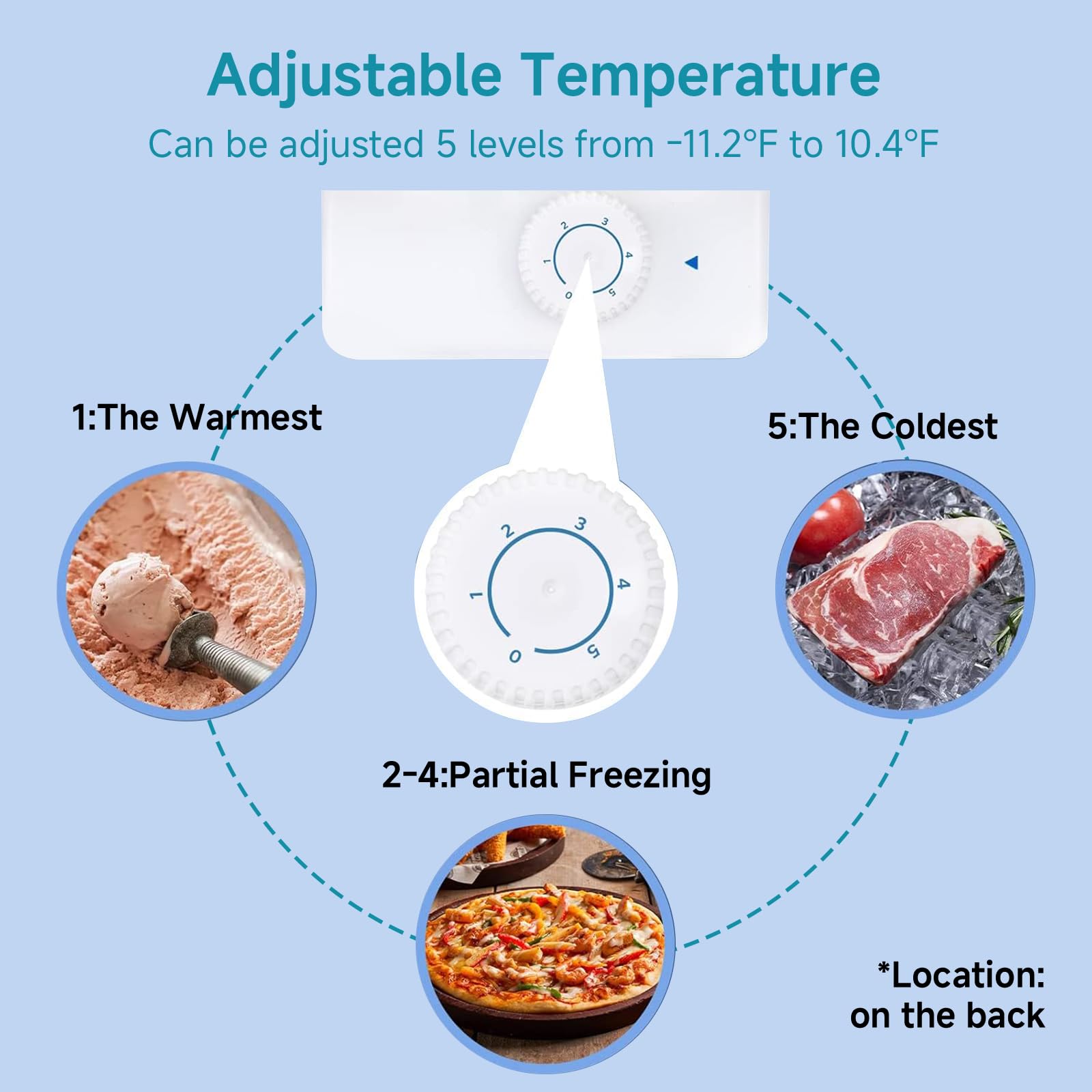 5-Grade Adjust Temperature: We provide 5 levels of temperature control. Choose your preferred temperature from the rear of the freezer. The temperature may be adjusted from -11.2°F to 10.4°F (-24°C to -12°C).