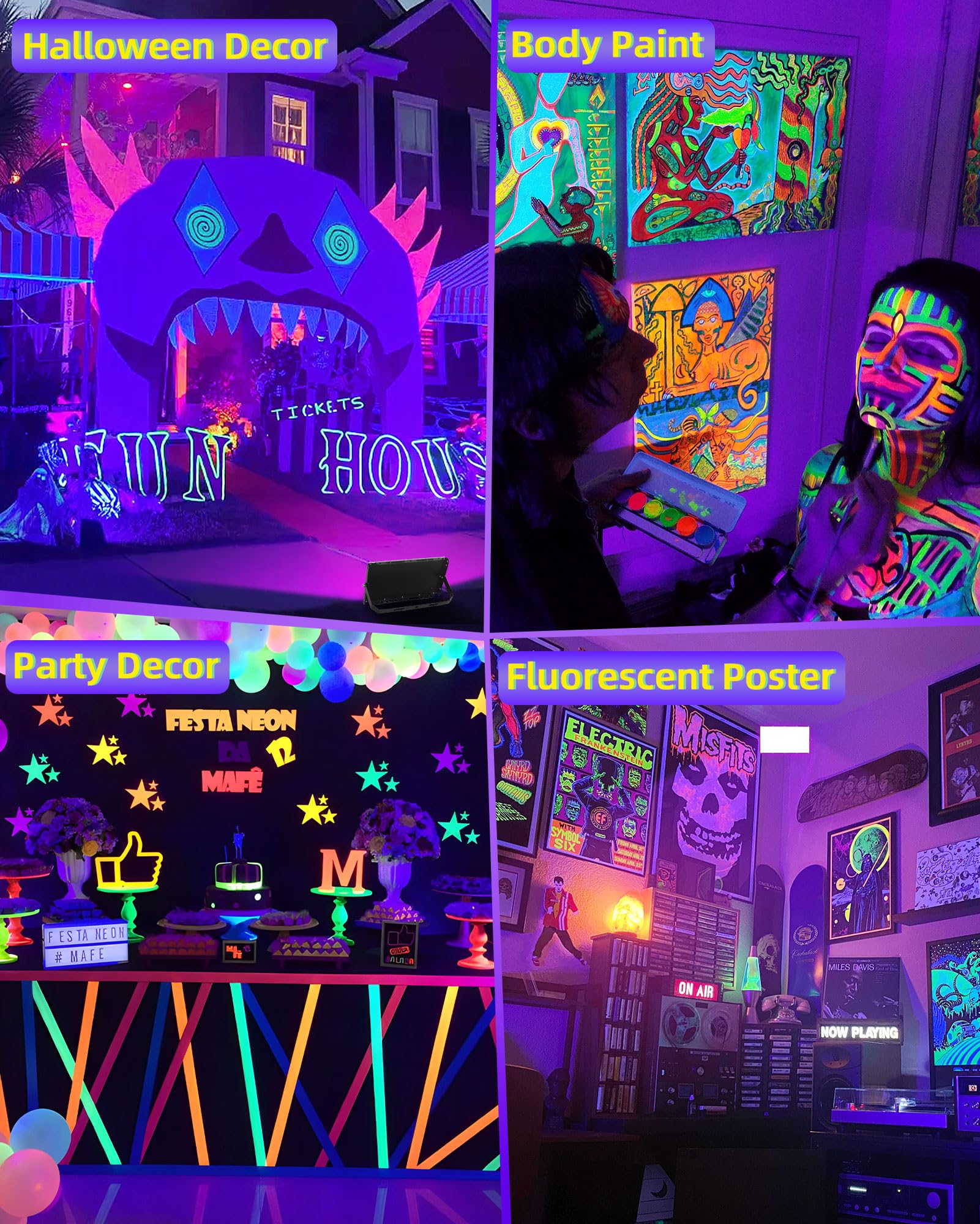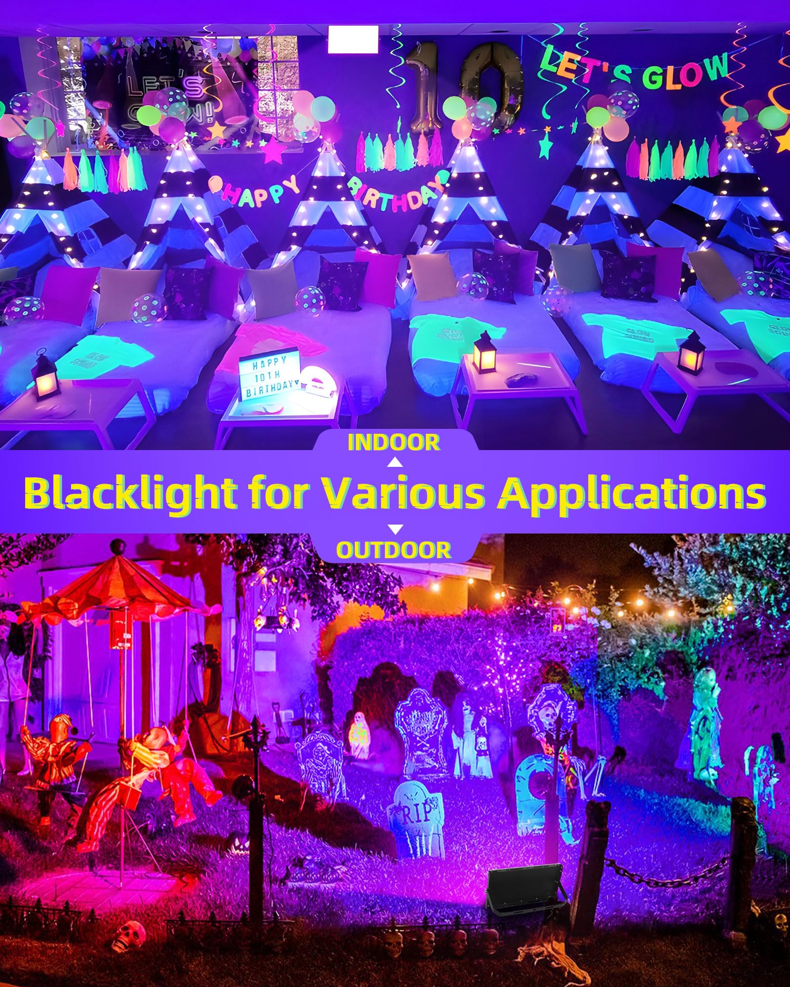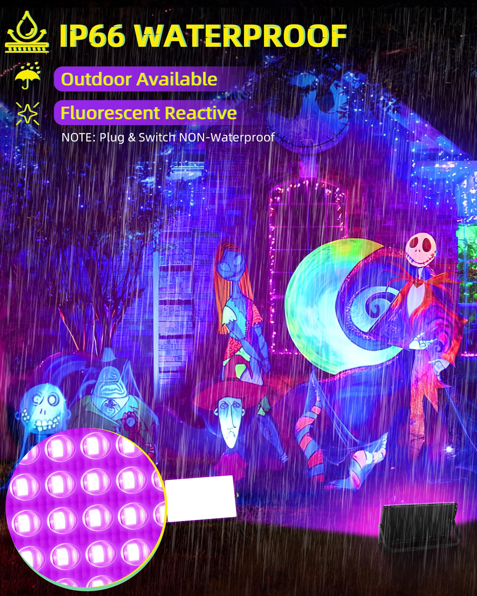 IP66 Waterproof for Wide Applications: IP66 waterproof rating, the outdoor black light can work in rain and snow, suitable for outdoor and indoor use. Great for outdoor Halloween decor, yard, porch, haunted houses, gymnasiums, classroom, bedroom, game room, etc. Works great for body paint, fluorescent posters, neon glow in the dark night, birthday party, dance party, etc. Easy to make a colorful and vibrant atmosphere! (Note: The plug is not waterproof)