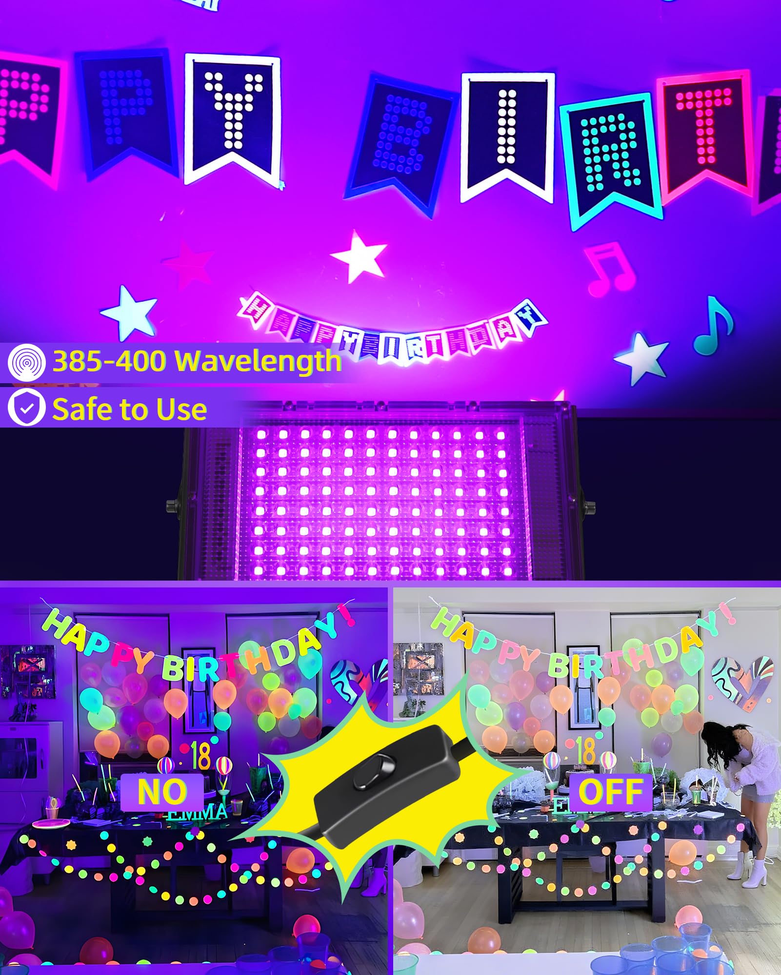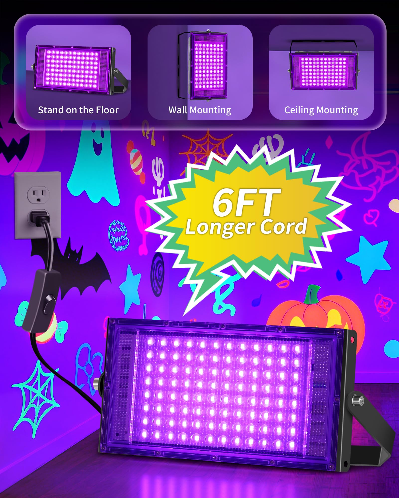 Convenient Switch, Long Power Cable: It is easy to turn the blacklight flood lights on and off with an ON/OFF switch built into the power cord, no need to unplug. Just turn on the switch and you will create a magic blacklight ambiance. Comes with a 6 FT power cord which is long enough for flexible placement, allowing you to install the light on high or distant places
