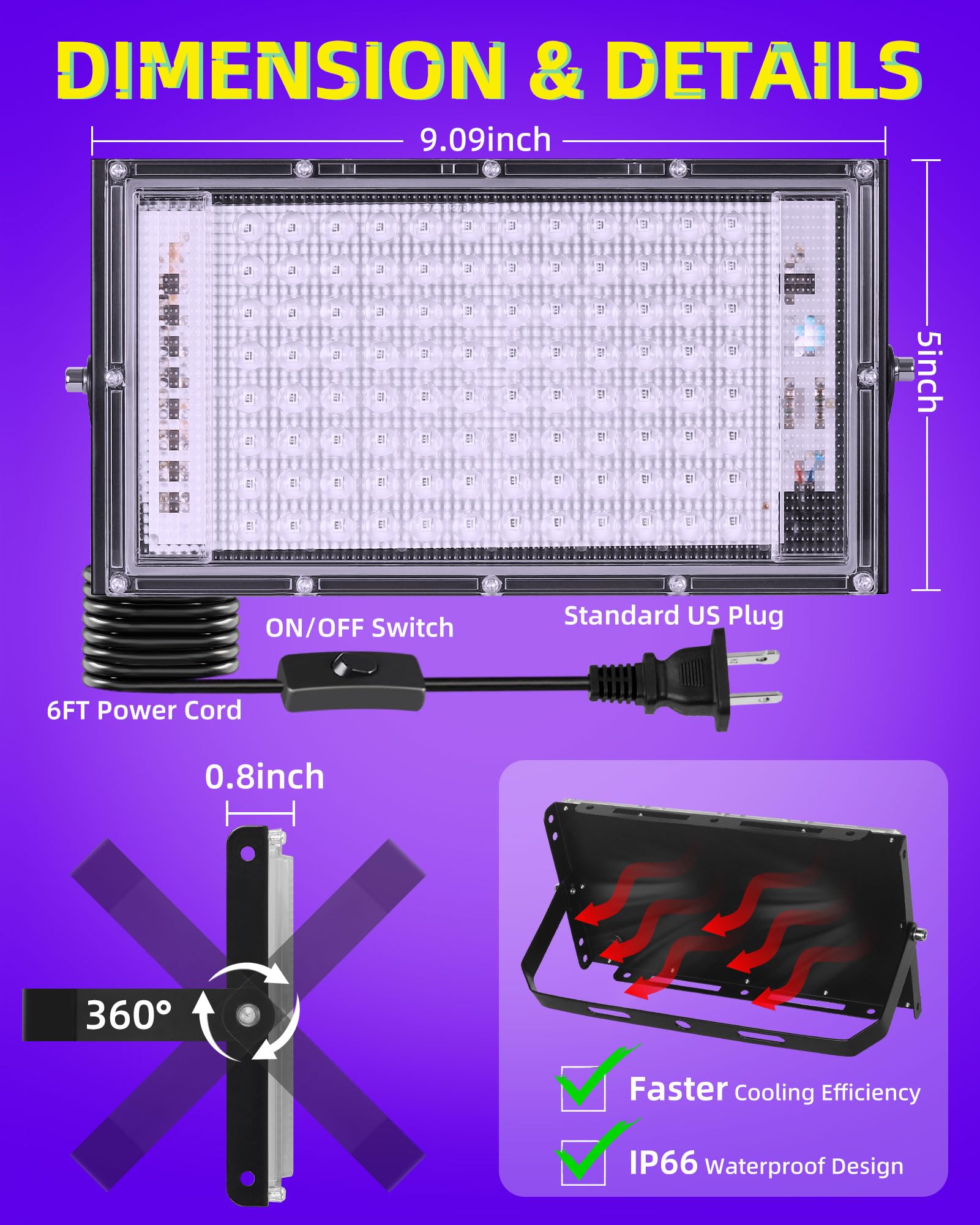 Excellent Fluorescent Effect Black Light: Equipped with 96 premium LEDs for creating excellent fluorescent effect, the 100W black light floodlight is brighter enough to illuminate a 2000 sq.ft space. Wavelength 385-400nm, suitale for working with most reactive pigments, dyes, paints and neon-colored objects