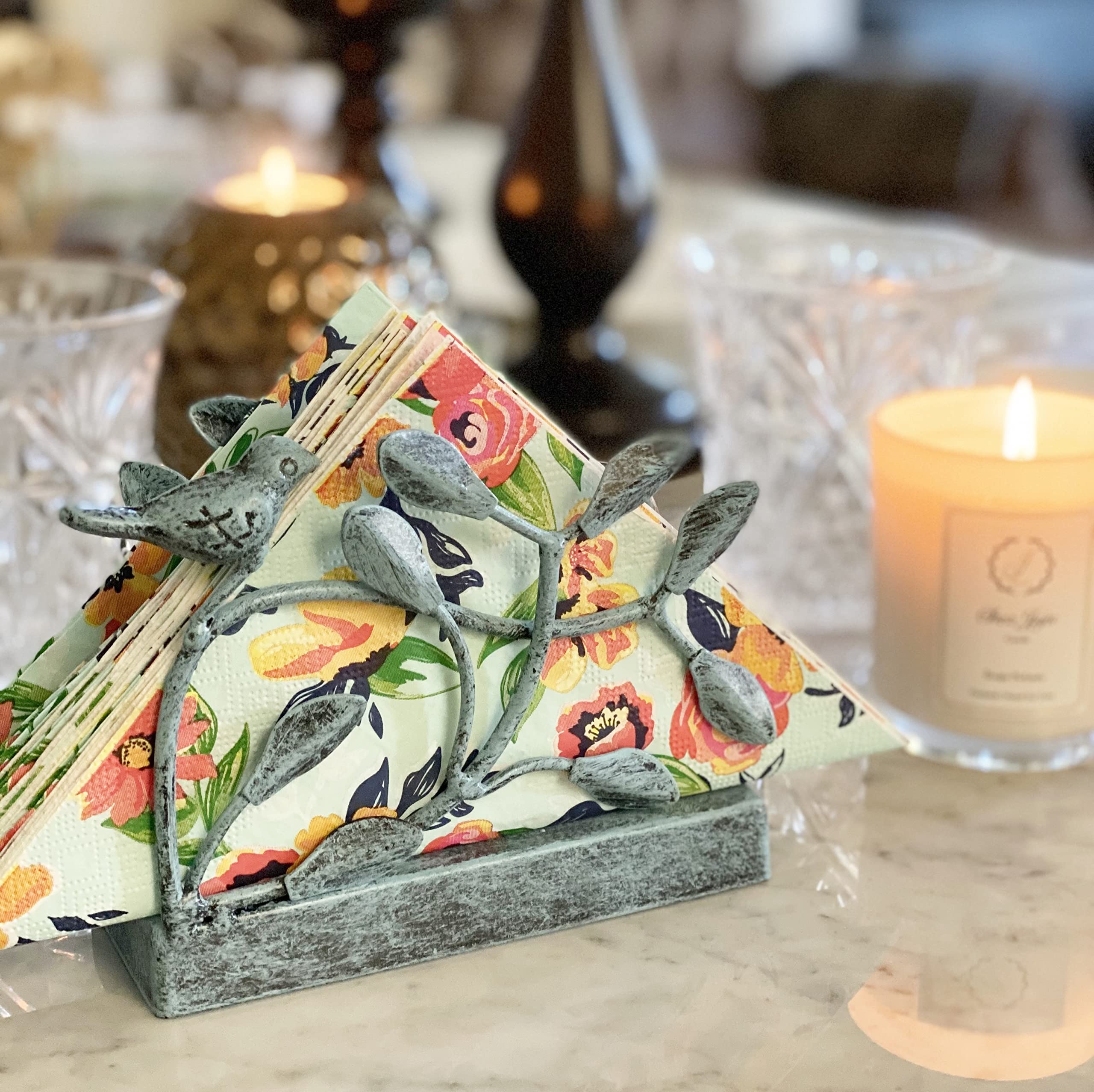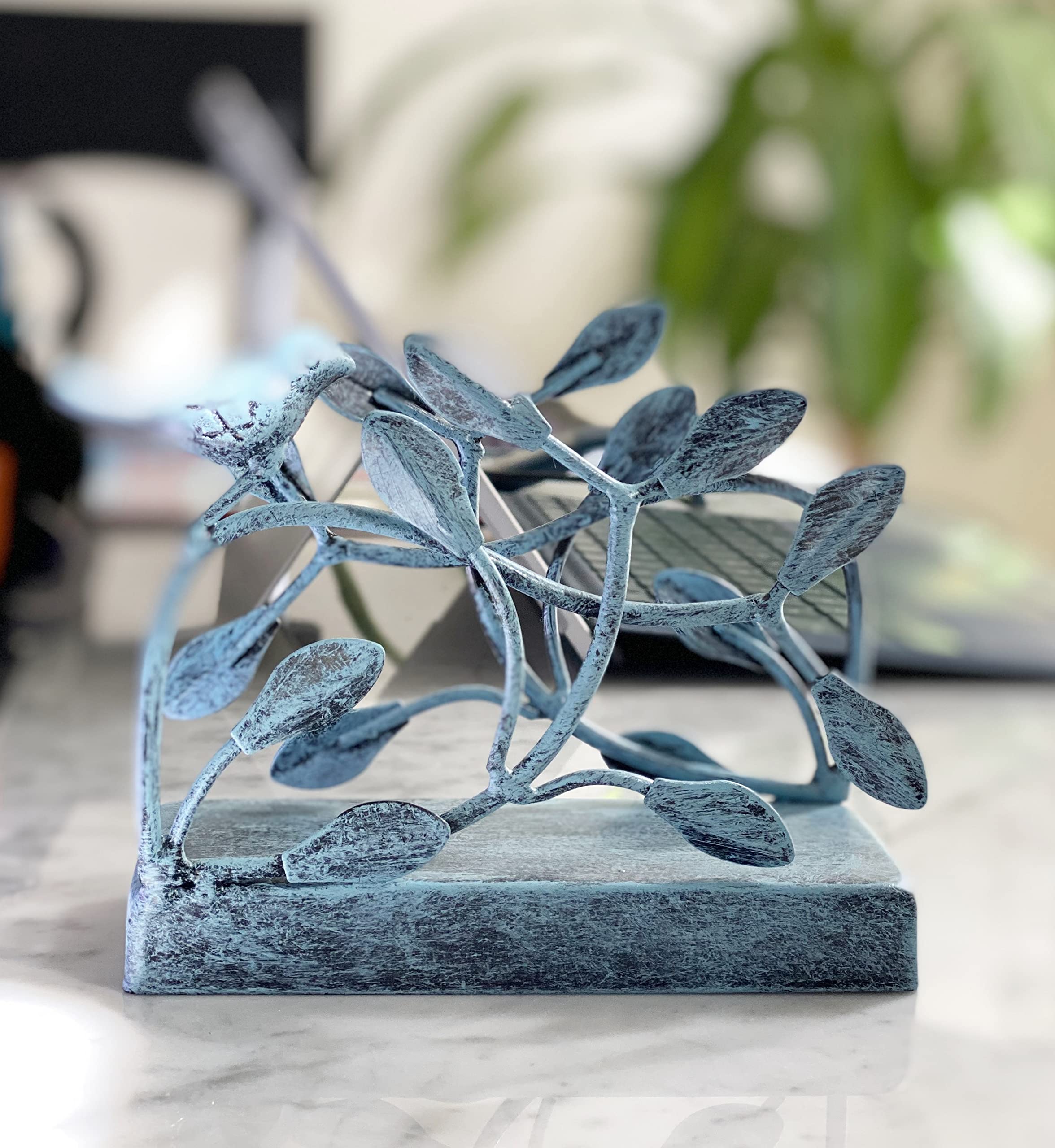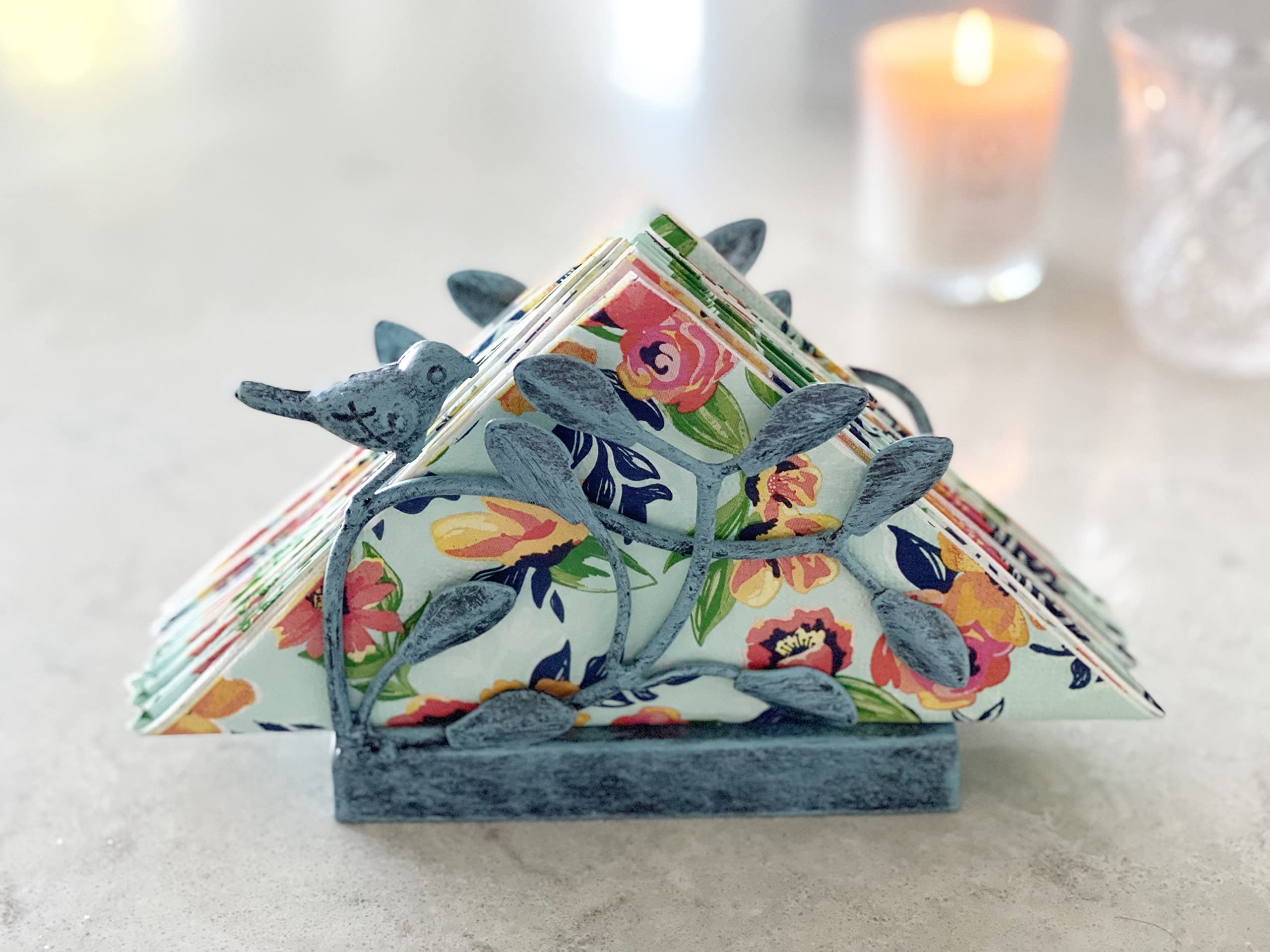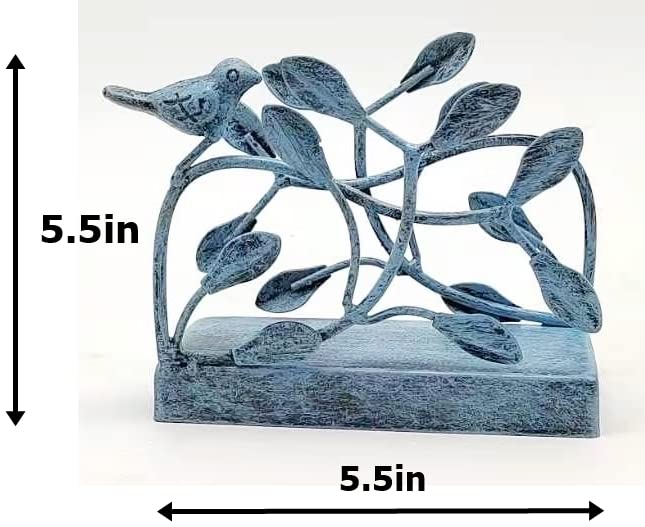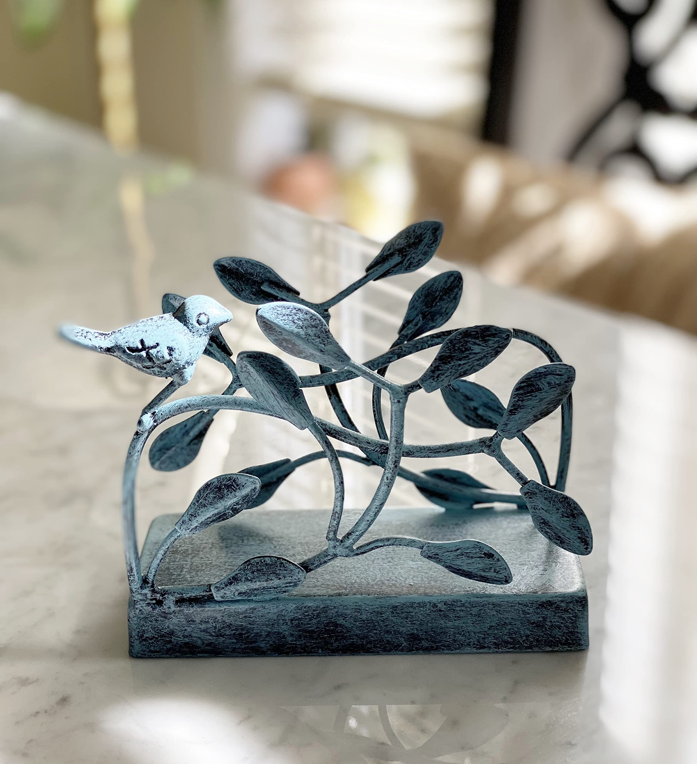 UNIQUE & STYLISH: Crafted from durable sturdy high quality metal for long-lasting beauty, our unique design vertical napkin caddy holder features charming garden style of leaves & tree branches with a lovely bird in antique blue finish. In particular, the bird is made of cast iron for a more vivid decorative presentation.