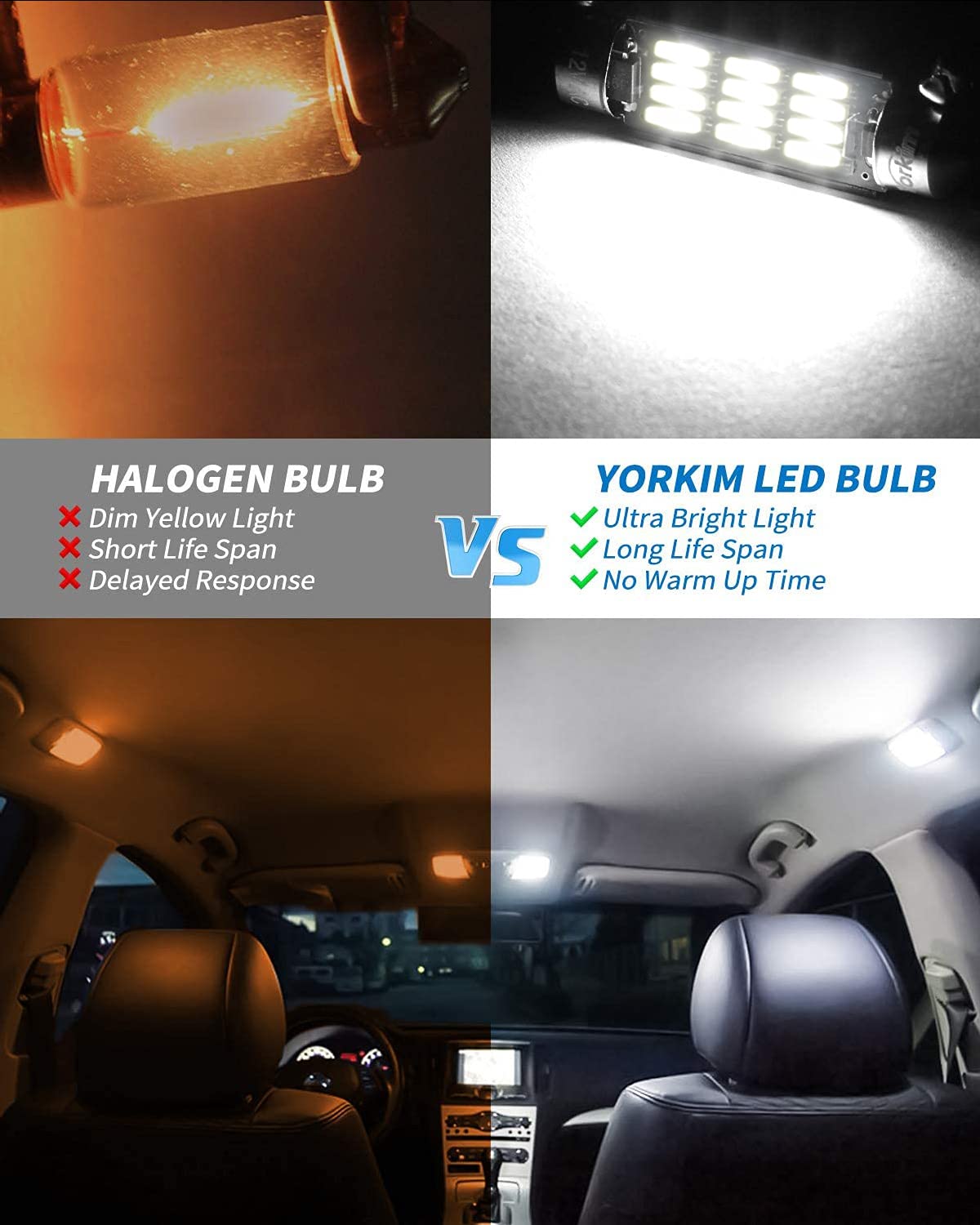 【FITMENT】 – Yorkim 6418 LED Bulb replacing 36mm 37mm 38mm 6411 6413 6418 C5W DE3021 DE3423 DE3425 3423 3425 6461 11005 12854 12844 bulbs. Super easy plug & play installation. Built-in canbus driver to bypass error check for most cars.