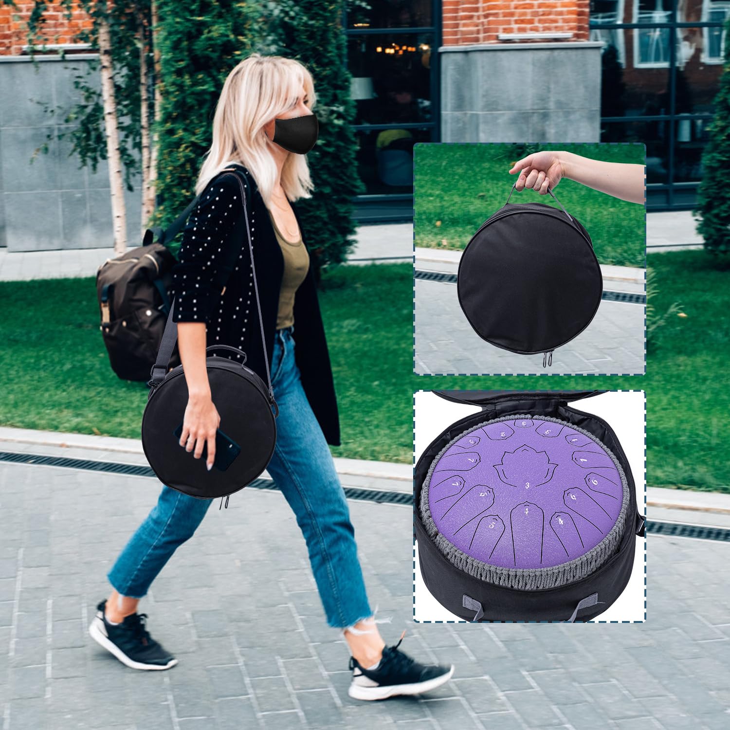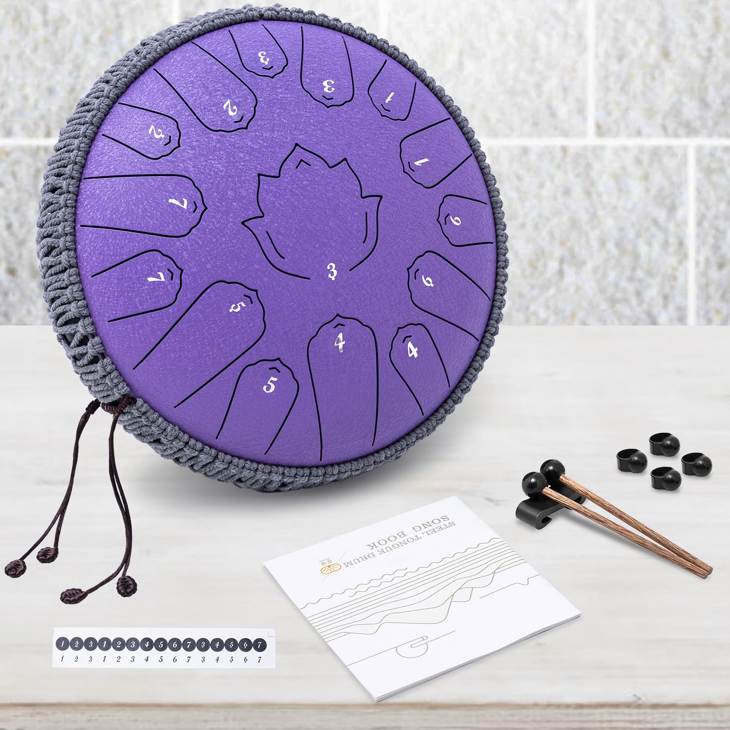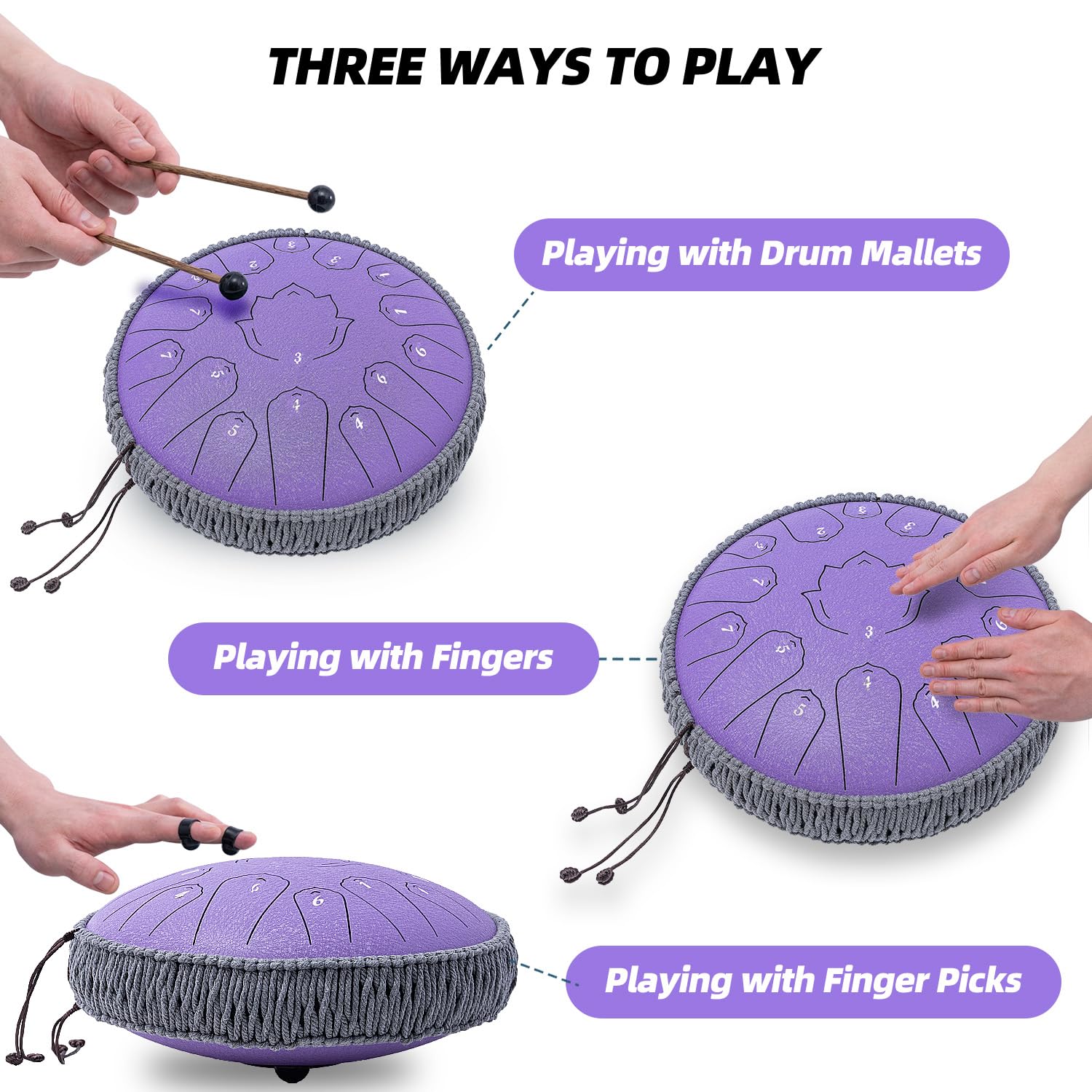 15 NOTES STEEL TONGUE DRUM:13 inch 15 notes steel tongue drum comes pre-tuned to the Mxied C-Key. The tone of the steel tongue drum is soft and melodious, you can feel the relaxation and joy from the heart.Which have a wider range of sound and can play more music. You can play drum with the included drum mallets or with you hands, and the included music book enable beginners to learn and play it more easily. Tongue drum comes with a carry-on bag for easy carrying
