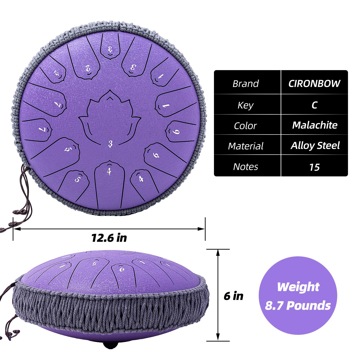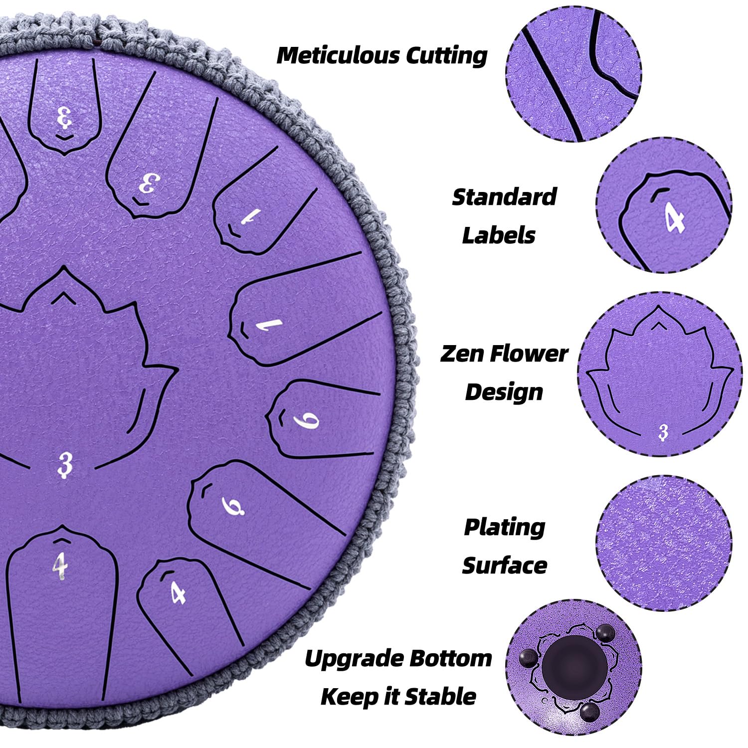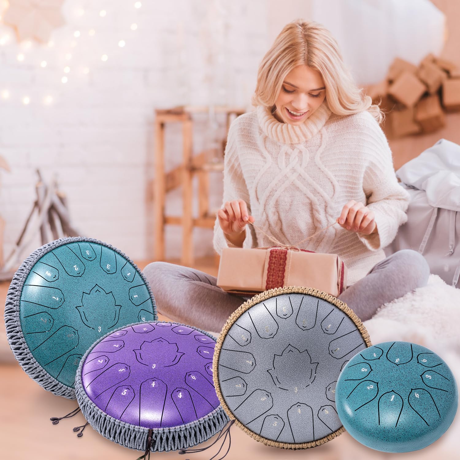 15 NOTES STEEL TONGUE DRUM:13 inch 15 notes steel tongue drum comes pre-tuned to the Mxied C-Key. The tone of the steel tongue drum is soft and melodious, you can feel the relaxation and joy from the heart.Which have a wider range of sound and can play more music. You can play drum with the included drum mallets or with you hands, and the included music book enable beginners to learn and play it more easily. Tongue drum comes with a carry-on bag for easy carrying
