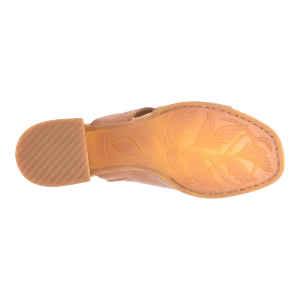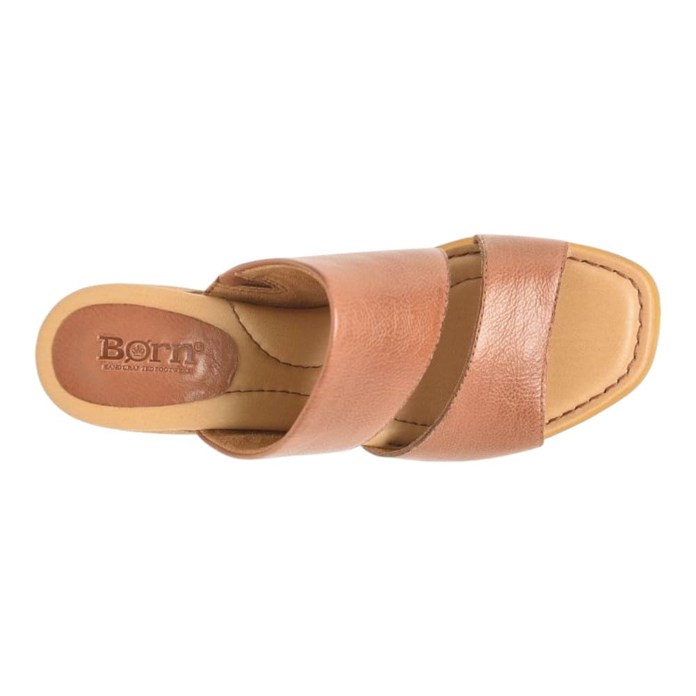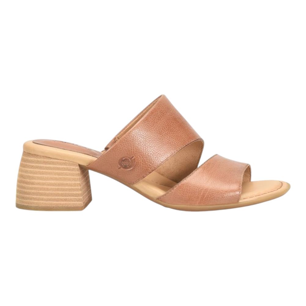 Description This simple easy to wear Born slide features a wide strap with an elastic hidden gore to hold the foot in place, while the front strap has an asymmetrical design to giving it a pop of style. The Shea is an easy to wear height with a raw leawood wrapped heel.