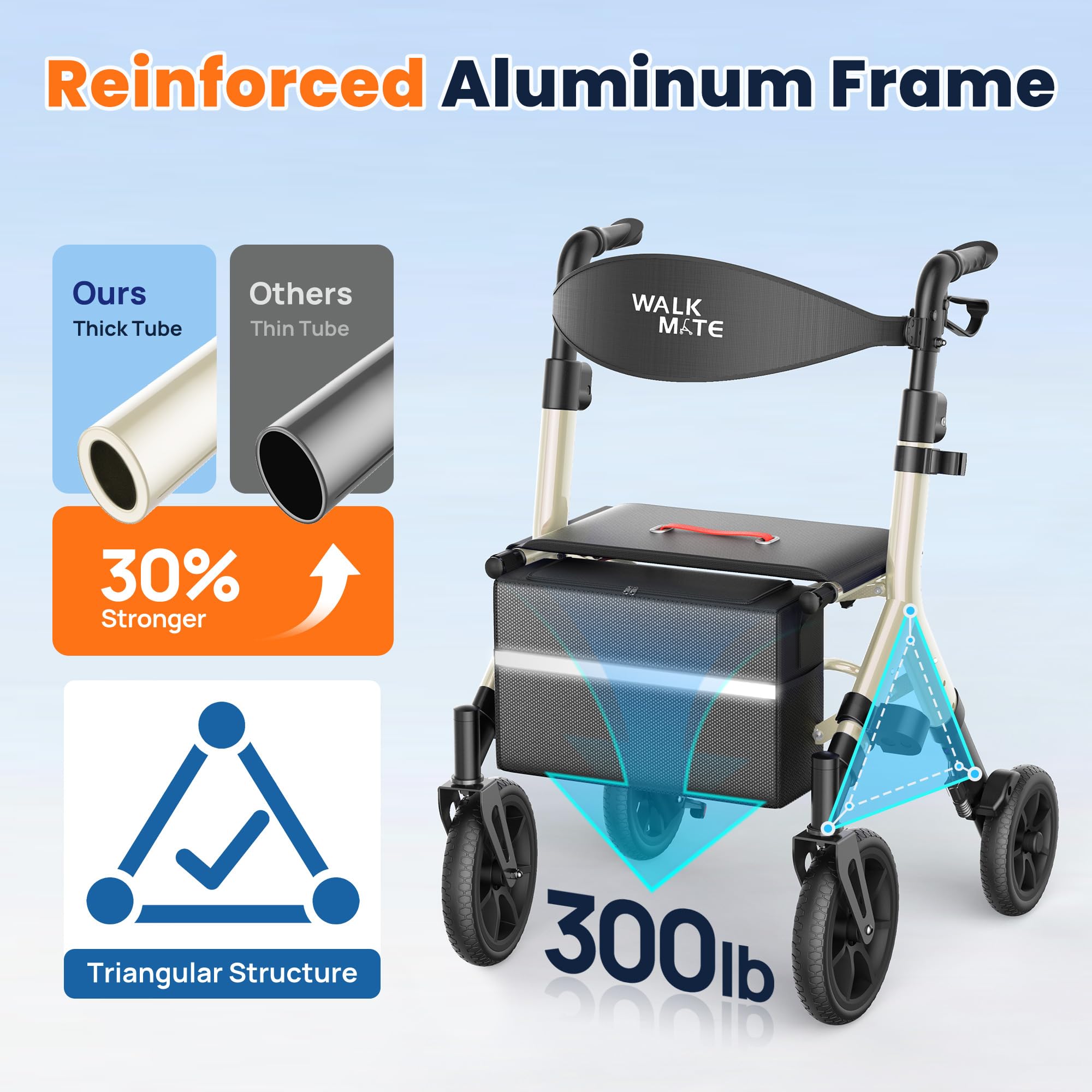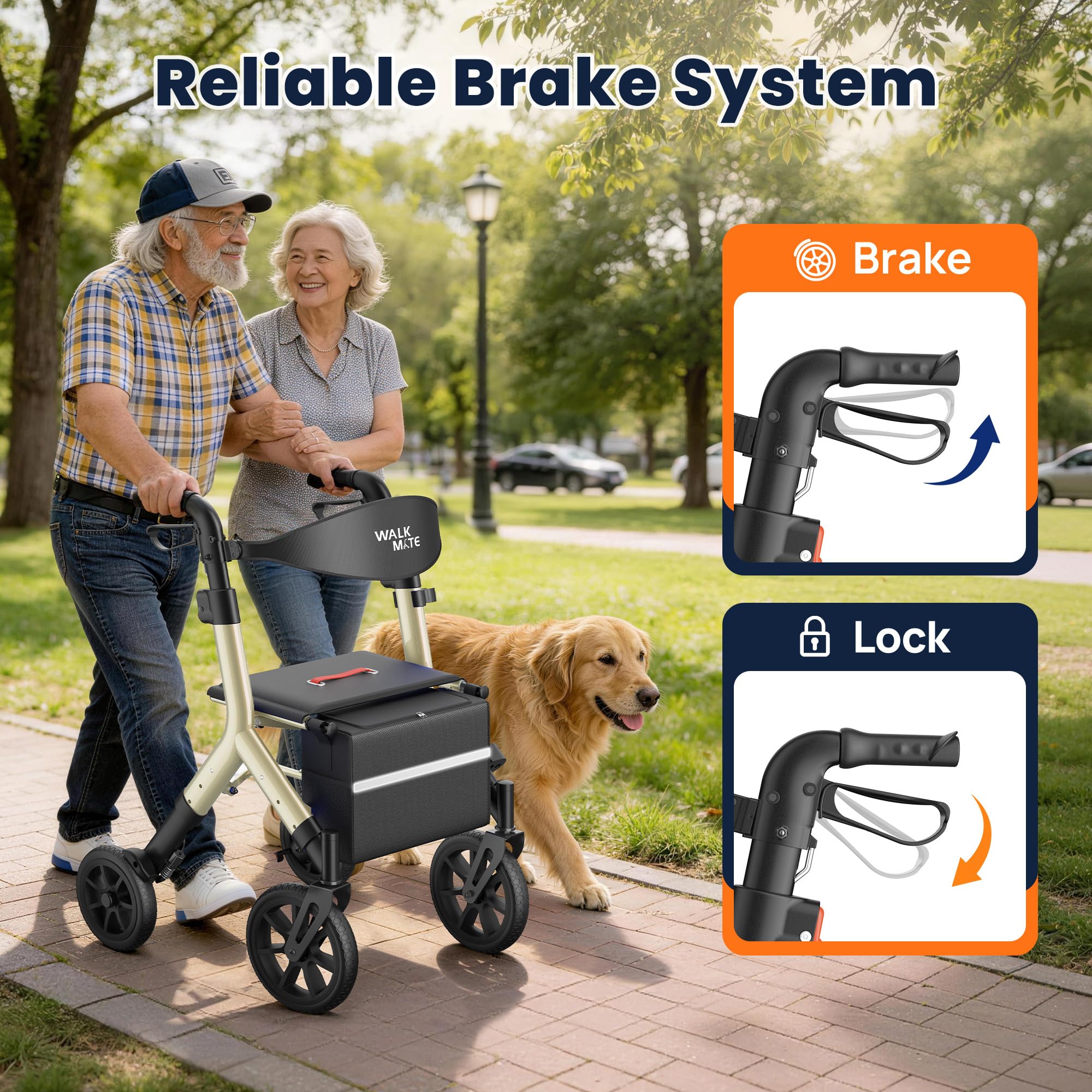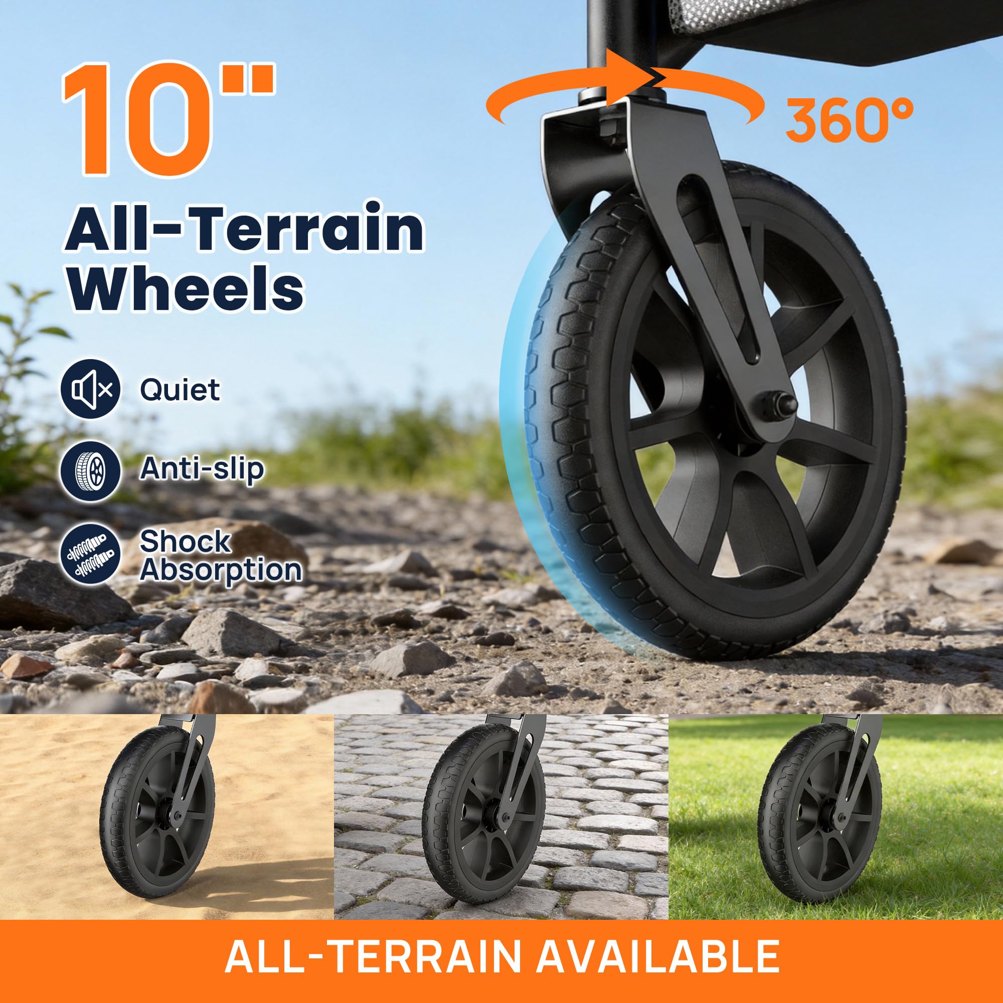 【10 Inch Wheels Fit for Multi-Terrain】Our WAlK MATE rollator walker for seniors comes with 10” front wheels, the anti-skid tread pattern on Wheels can provide greater grip on the ground to prevent your rollator walker from slipping while walking, and this 10" larger wheel walker suitable for most terrain.