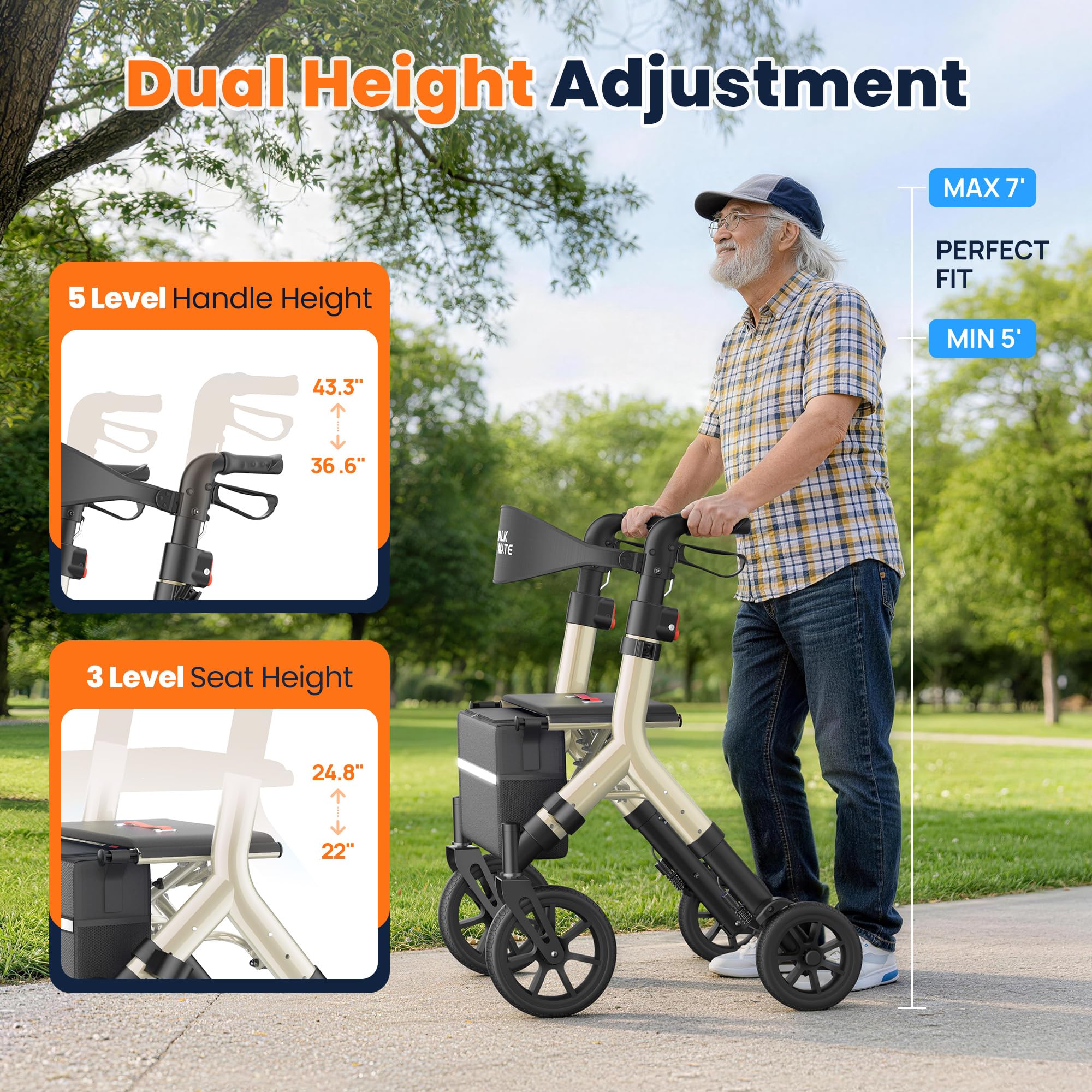 【Multiple Safeties】The roalltor walker equipped dual-brakes system- easily control your walker speed by the brake handler. You can also press the brake handler to lock the brake when you desire to sit down on the seat. Moreover, the fluorescent strip on the storage bag and the red strip on the wheels can protect you keep away from the vehicle in the dark.
