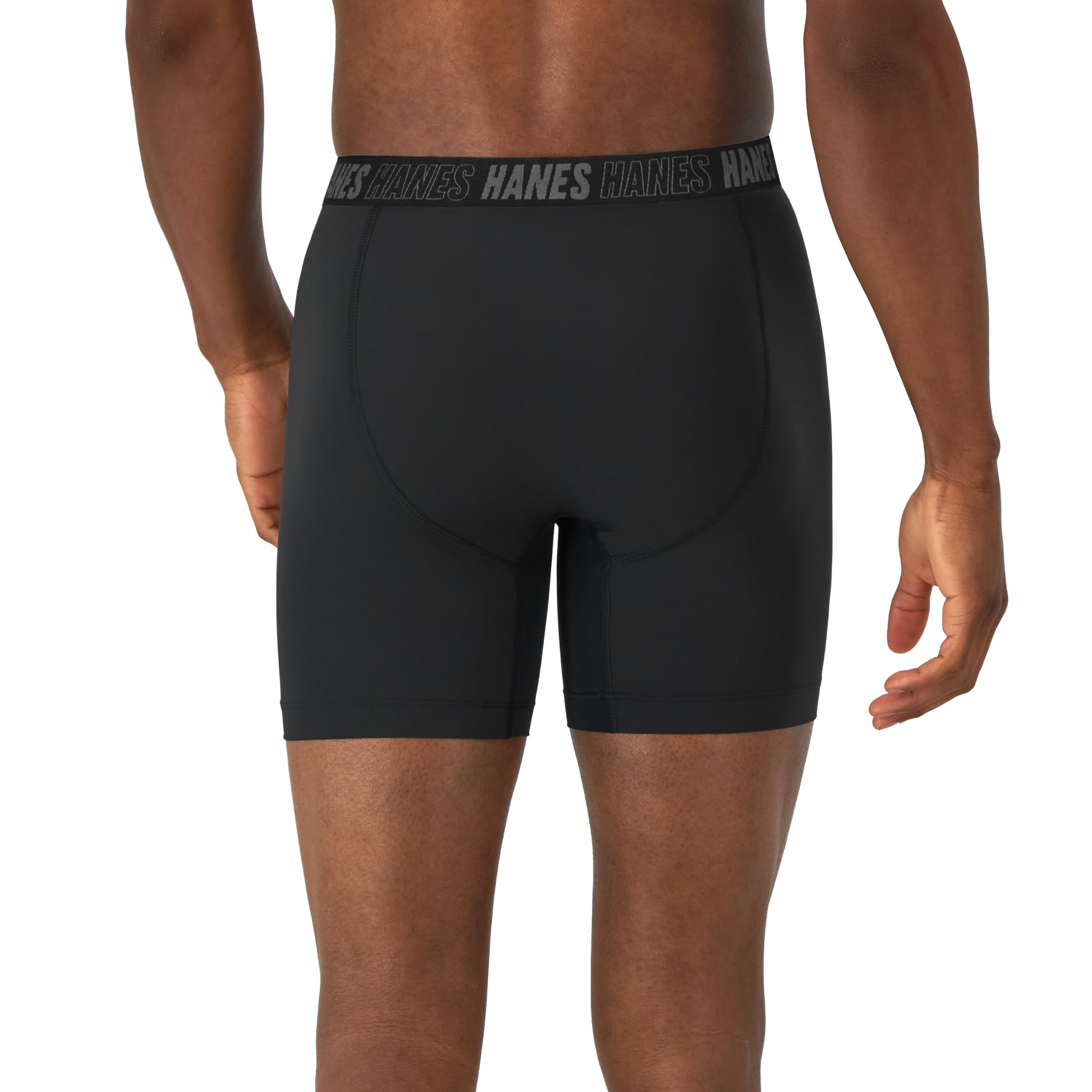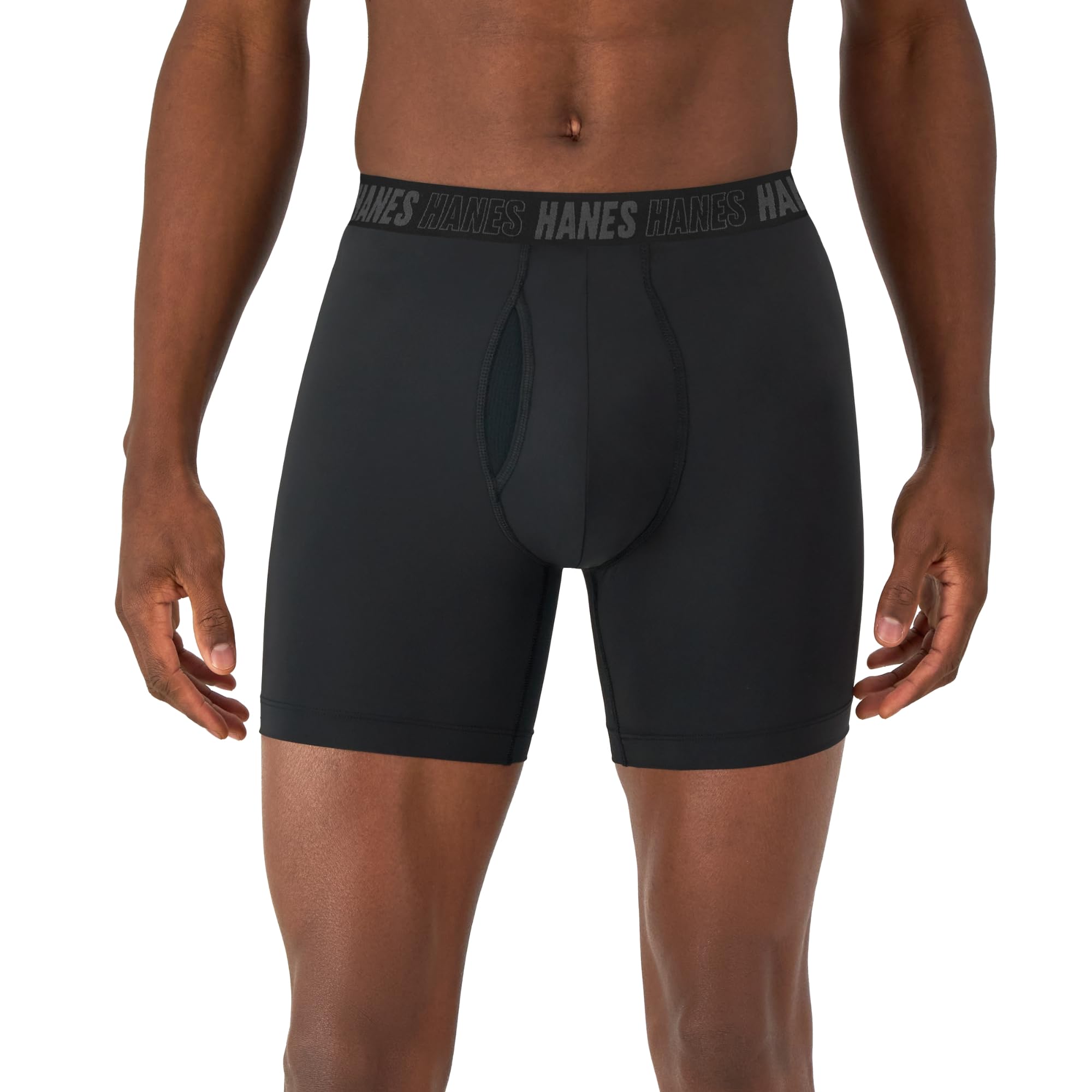 Description Hanes Moves™ Total Support Pouch® men’s boxer briefs are sweat-wicking and stretchy enough for the active days and comfortable enough for the kick-back-and-rest days. Featuring breathable mesh panels, the Hanes Total Support Pouch separates and supports - ensuring all-day anti-chafing comfort. Targeted mesh and cooling zones enhance ventilation. Built with X-Temp™ technology, these men’s boxer briefs are designed to adapt to your temperature, while moisture-wicking fabric and a quick-dry pouch lift sweat away. Flexibility is key, and this high 4-way stretch fabric teams up with advanced no-ride-up legs to help you perform your best without feeling restricted. A real game-changer, this boxer brief underwear for men is available in a convenient 3-pack featuring logo waistbands. Hanes Moves. Ready for anything.