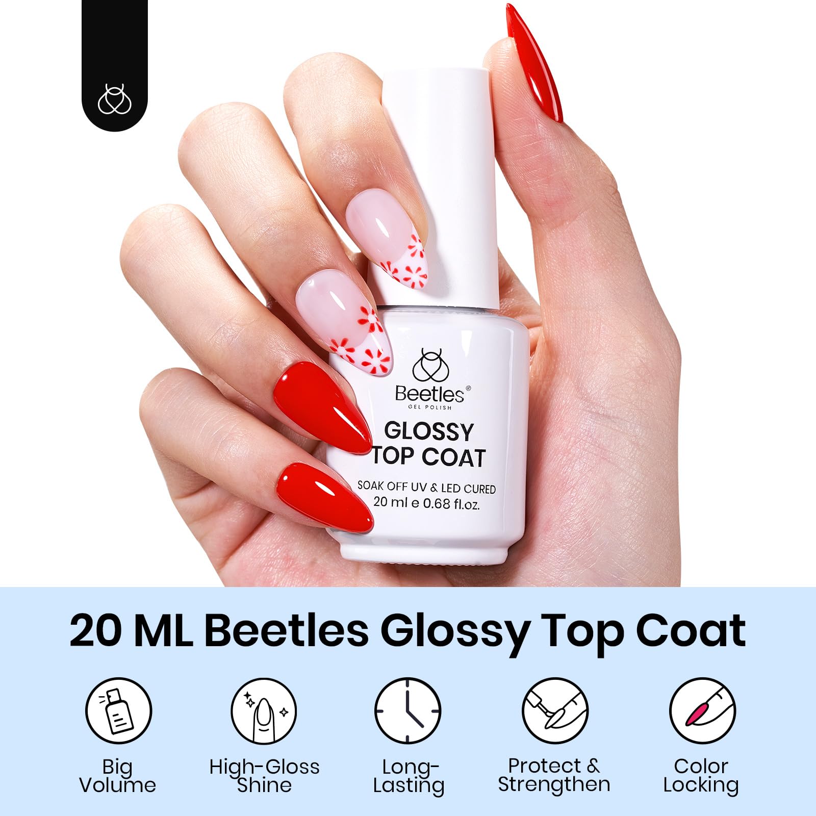 Beetles Extra Glossy Top Coat : The gel top coat avoids nicks and chips. top coat smooth surface, effective, more wear-resistant and scratch-resistant, High gloss like a mirror, long-lasting color protection! Tips: Avoid touching your nails after curing the top coat for 2 minutes to enhance the shine.