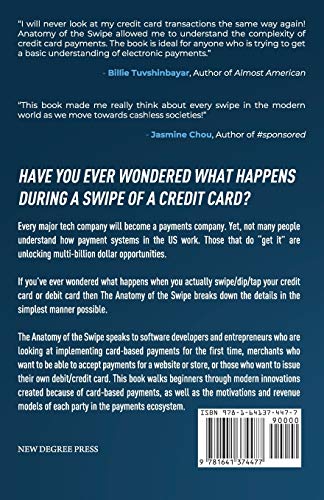 Have you ever wondered what happens during a swipe of a credit card? Every major tech company will become a payments company. Yet, not many people understand how payment systems in the US work. Those that do “get it” are unlocking multi-billion dollar opportunities. If you’ve ever wondered what happens when you actually swipe/dip/tap your credit card or debit card then The Anatomy of the Swipe breaks down the details in the simplest manner possible. Here are some questions answered within these pages: How does money move from my credit card to my favorite coffee shop? How can I build a neo-bank? How can I build my own debit or credit card? How can I accept card based payments? The Anatomy of the Swipe speaks to software developers and entrepreneurs who are looking at implementing card-based payments for the first time, merchants who want to be able to accept payments for a website or store, or those who want to issue their own debit/credit card. This book walks beginners through modern innovations created because of card-based payments, as well as the motivations and revenue models of each party in the payments ecosystem. Content from the book plus more is taught via a cohort based course now too: https://maven.com/anatomyoftheswipe/payments101