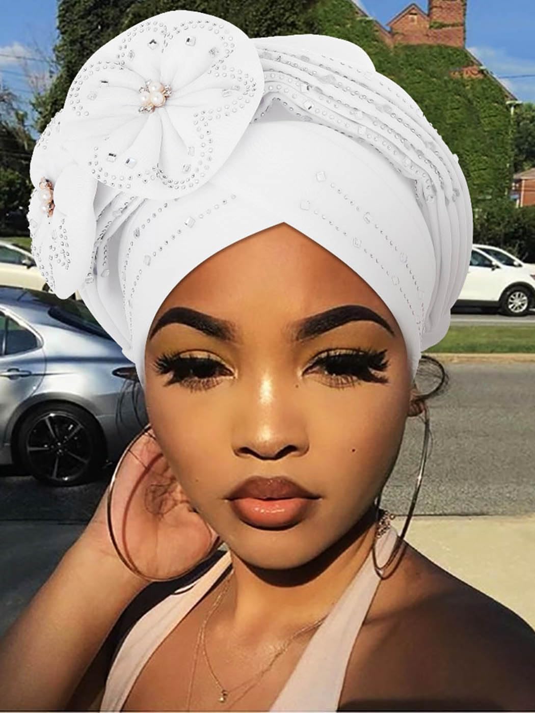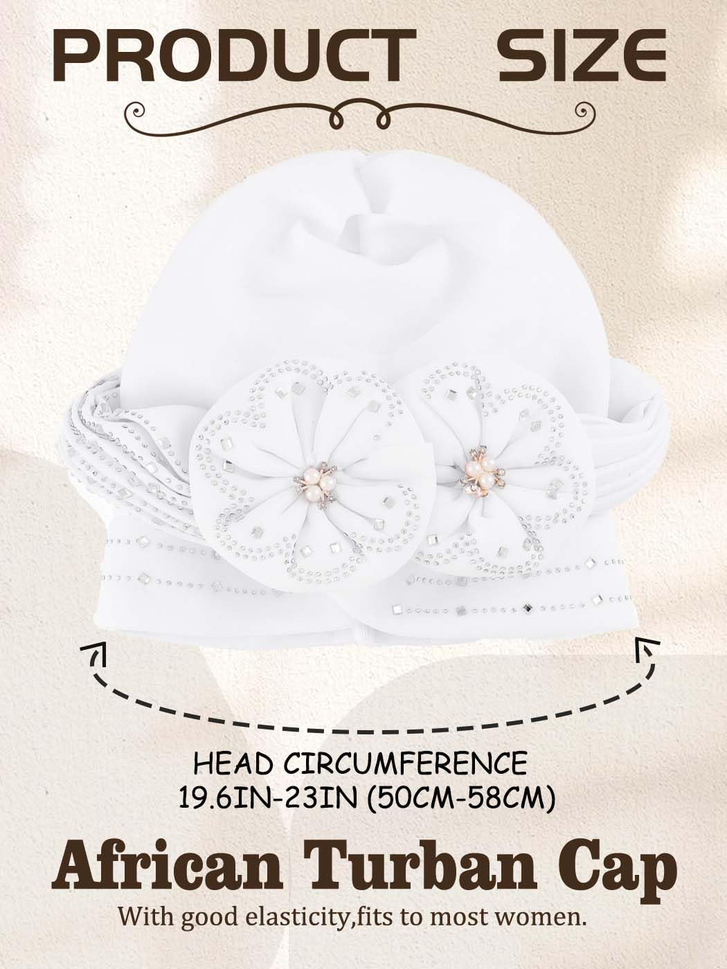 White headwrap head circumference is around 19.6 - 23 inch (50 - 58 cm); It suits for most women and girls. 1 piece.