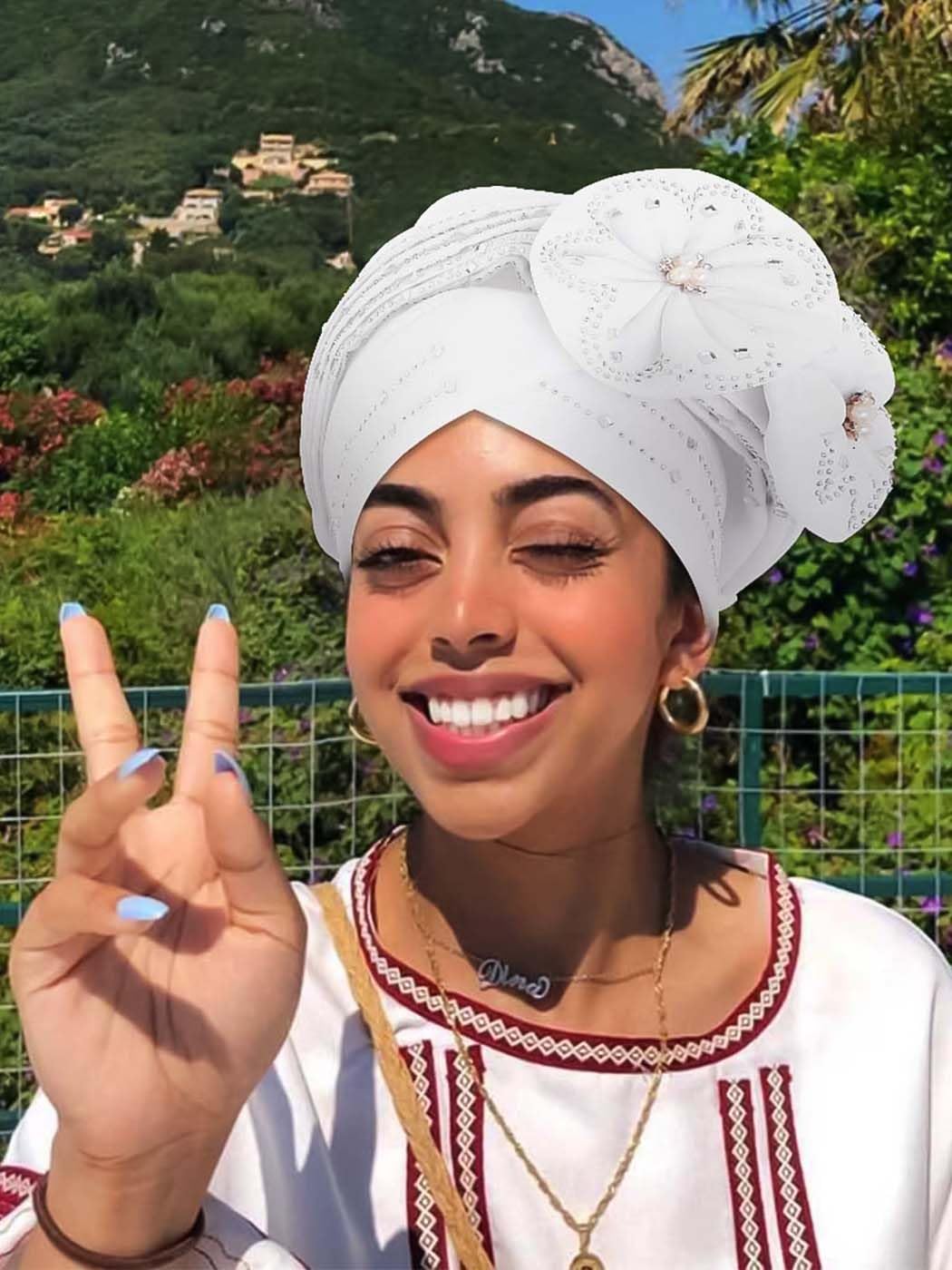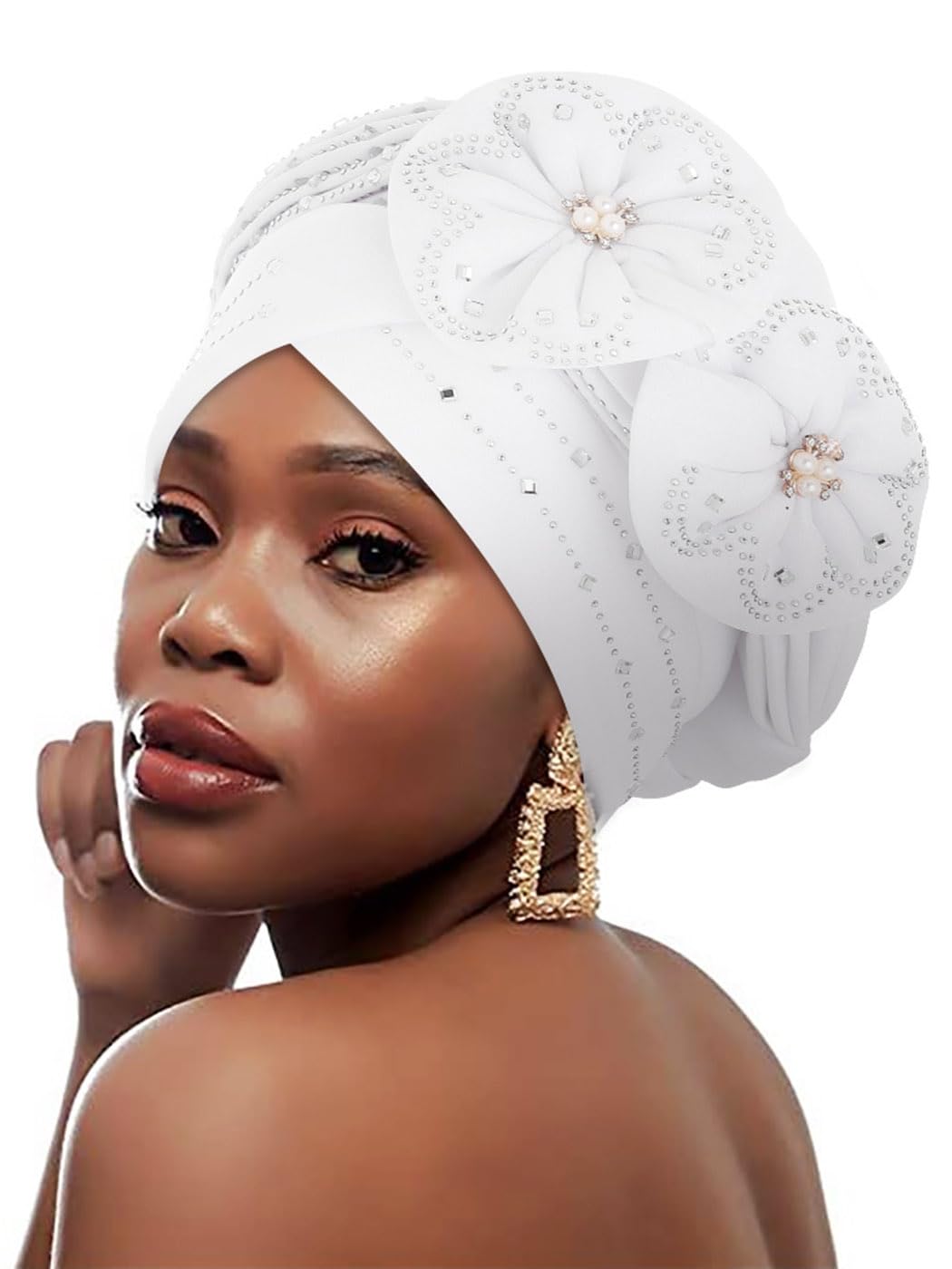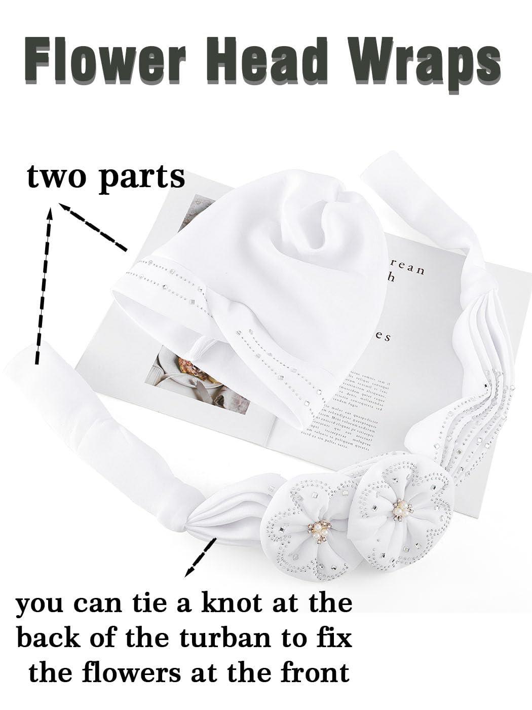 African turban is made of high-quality polyester material with bling rhinestones. The turban consists of two parts. You can tie a knot at the back of the turban to fix the flowers part at the front.