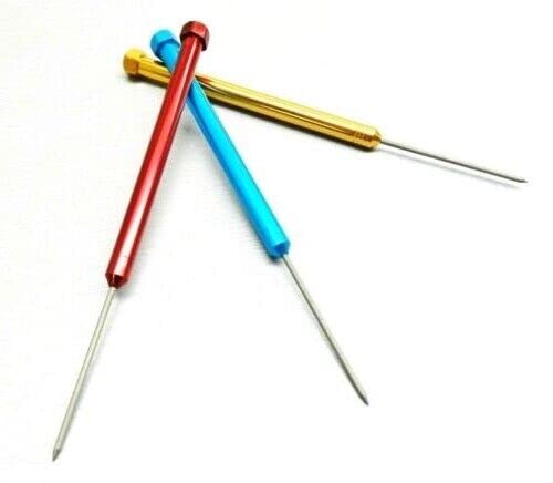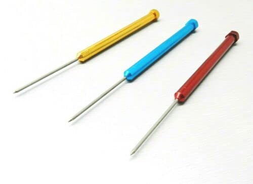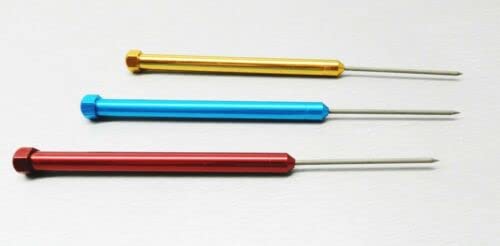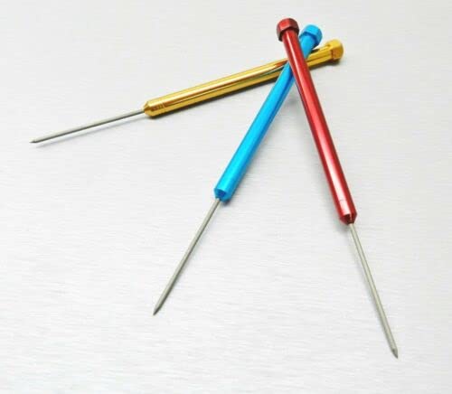 🟢 SET OF 3 SOLDERING PICKS TITANIUM TIP 🟢 NON-ROLLING HANDLE 🟢 SET OF 3 PICKS RED - BLUE – GOLD COLORS 🟢 A set of 3 soldering picks designed and made to handle precious metals when soldering and working with gold and silver solder operations in their molten state. 🟢 These Titanium solder picks will withstand high temperature without metals sticking or adhering to the tip. 🟢 These are deluxe pick are the most popular picks available they come with a handle that feature a non-roll hex head handle with a titanium shaft. 🟢 Set of picks in three handle colors...each pick can be used for different metals – karat types. 🟢 Soldering pick is the absolute best for all non-ferrous metals except platinum. 🟢 These picks are for use with gold, silver and other metals, it is NOT recommended for use with platinum. 🔻 SPECIFICATIONS: JETS Product # 1919-953 🔻 🔸 Overall Length: 6-1/2” - 165mm 🔸 Pick Length: 2” - 53mm 🔸 Pick Diameter: 5/64” - 4.87mm 🔸 Handle: Non-Rolling Handle (with Hex End Head) 🔸 Handle Length: 4-5/16” - 110mm 🔸 Handle Diameter: 5/16” - 7.9mm 🔸 Weight: 0.6oz. - 16gr