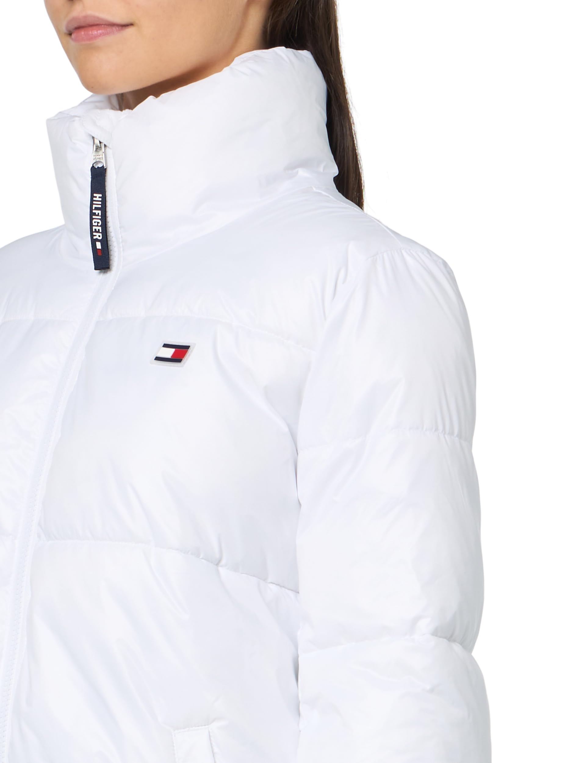 Description This Tommy Hilfiger Women's Performance Jacket is a Boxy puffer jacket Stand collar Snap pockets Logo zipper puller Logo flag patch