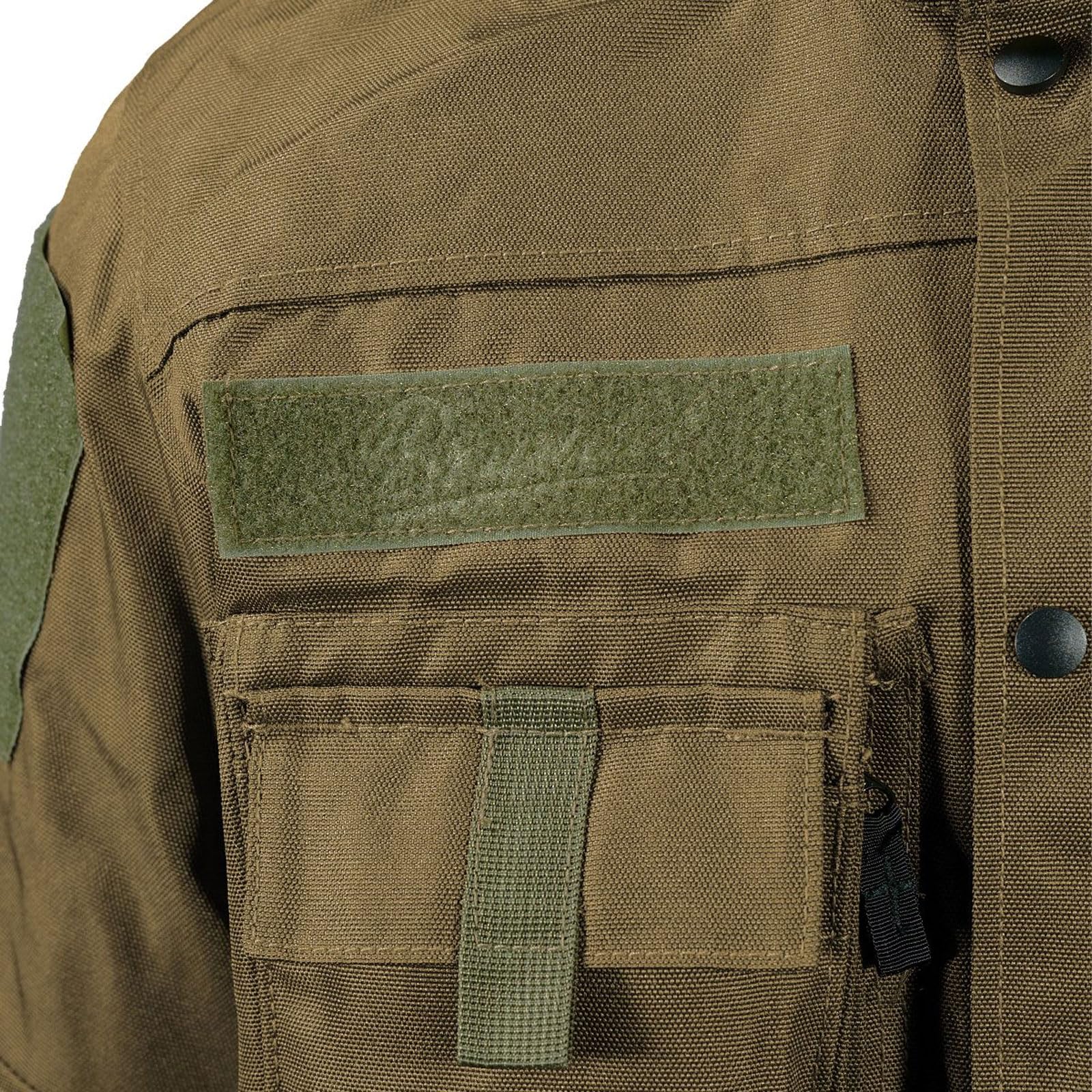 Cuffs with Velcro fastener. Underarm pocket with reverse zip. Molle straps on chest and pocket