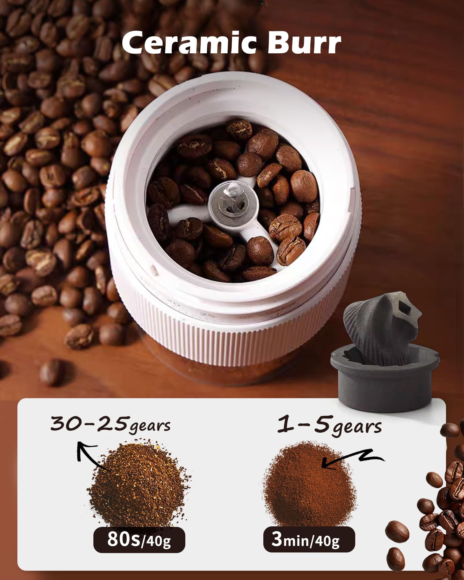 With a 40g bean capacity, this burr coffee grinder is designed for efficiency without compromising on flavor preservation. The conical ceramic burrs ensure a uniform grind for a delightful coffee experience every time.
