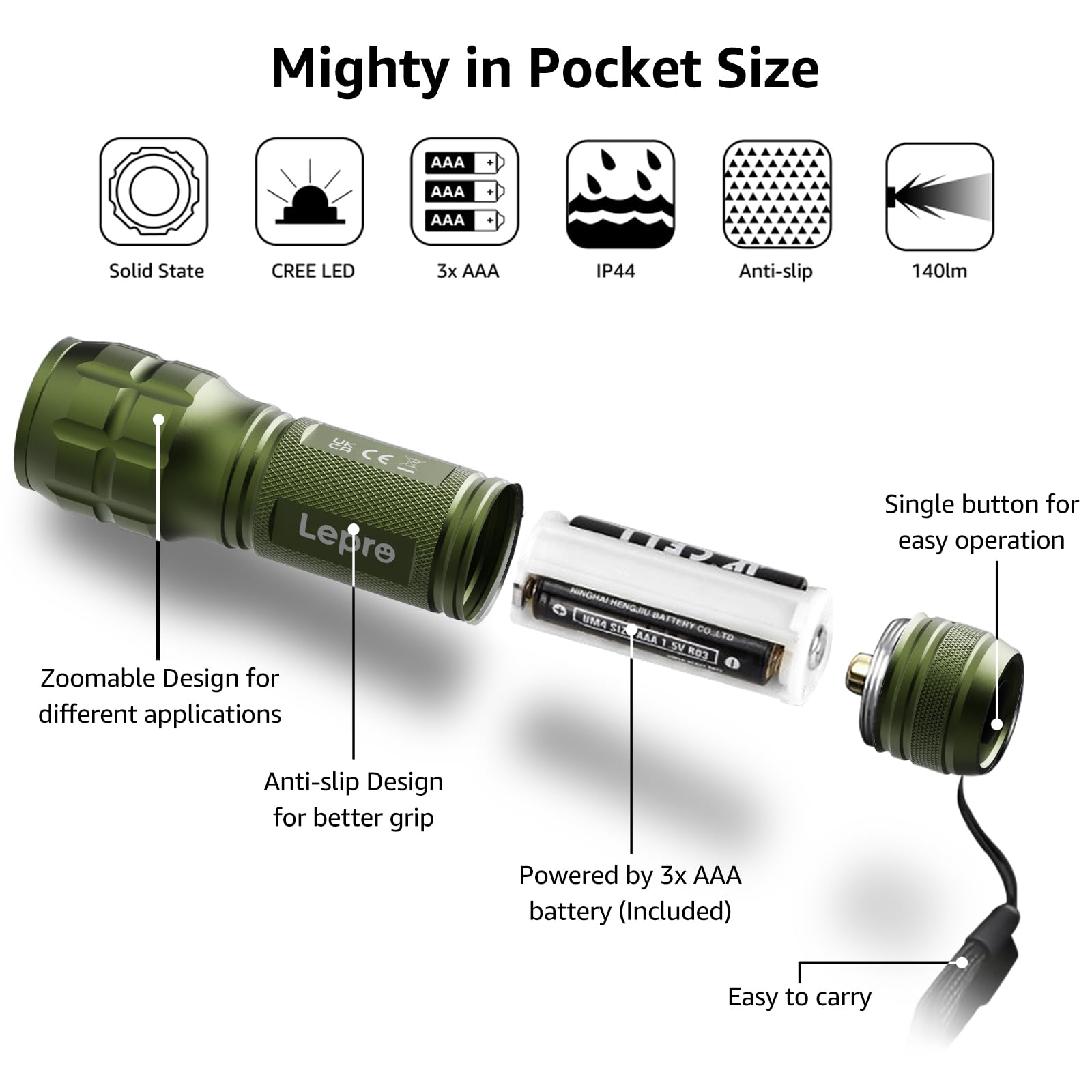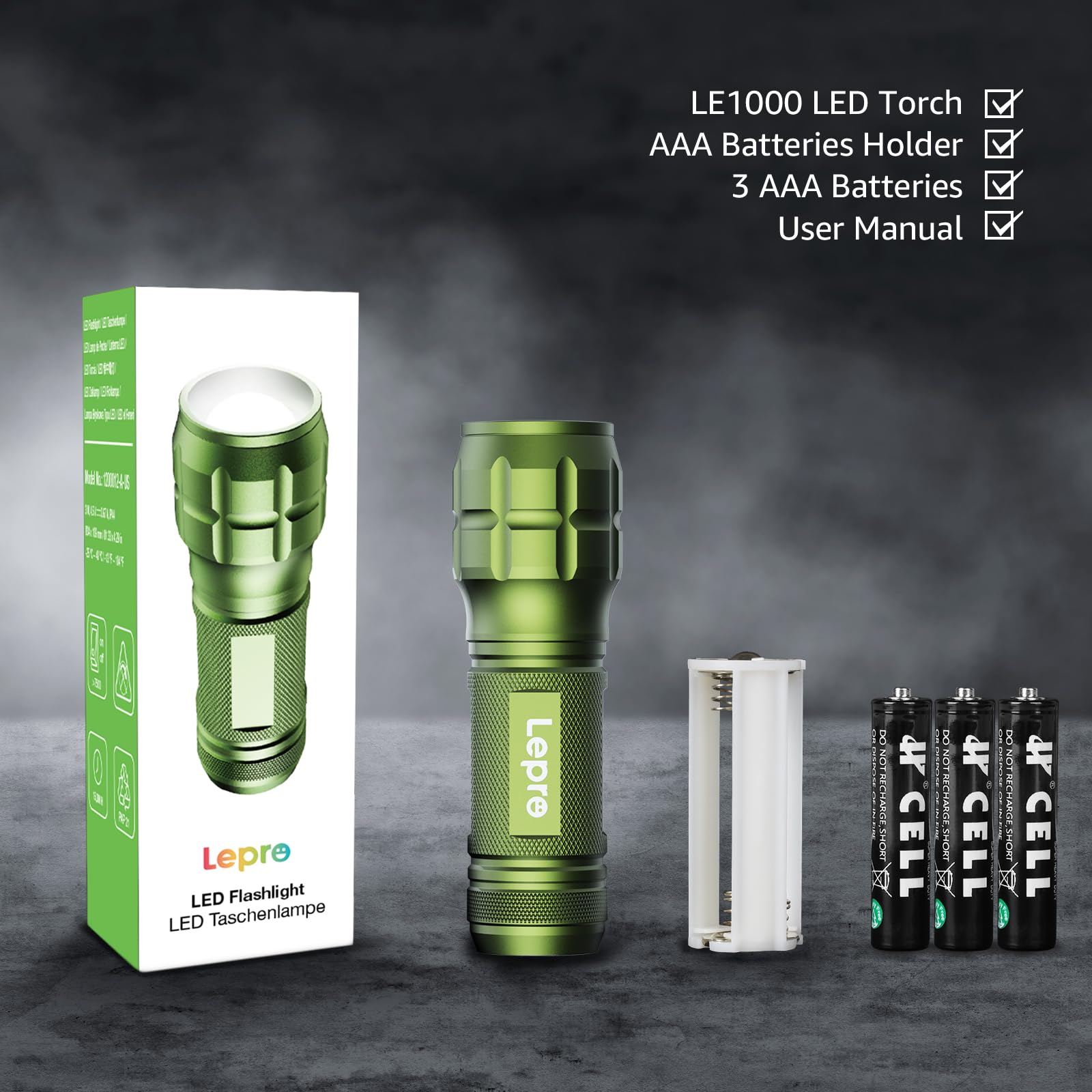 WHAT YOU GET- Bright and handheld led flashlight *1, AAA batteries*3 and instruction manual.