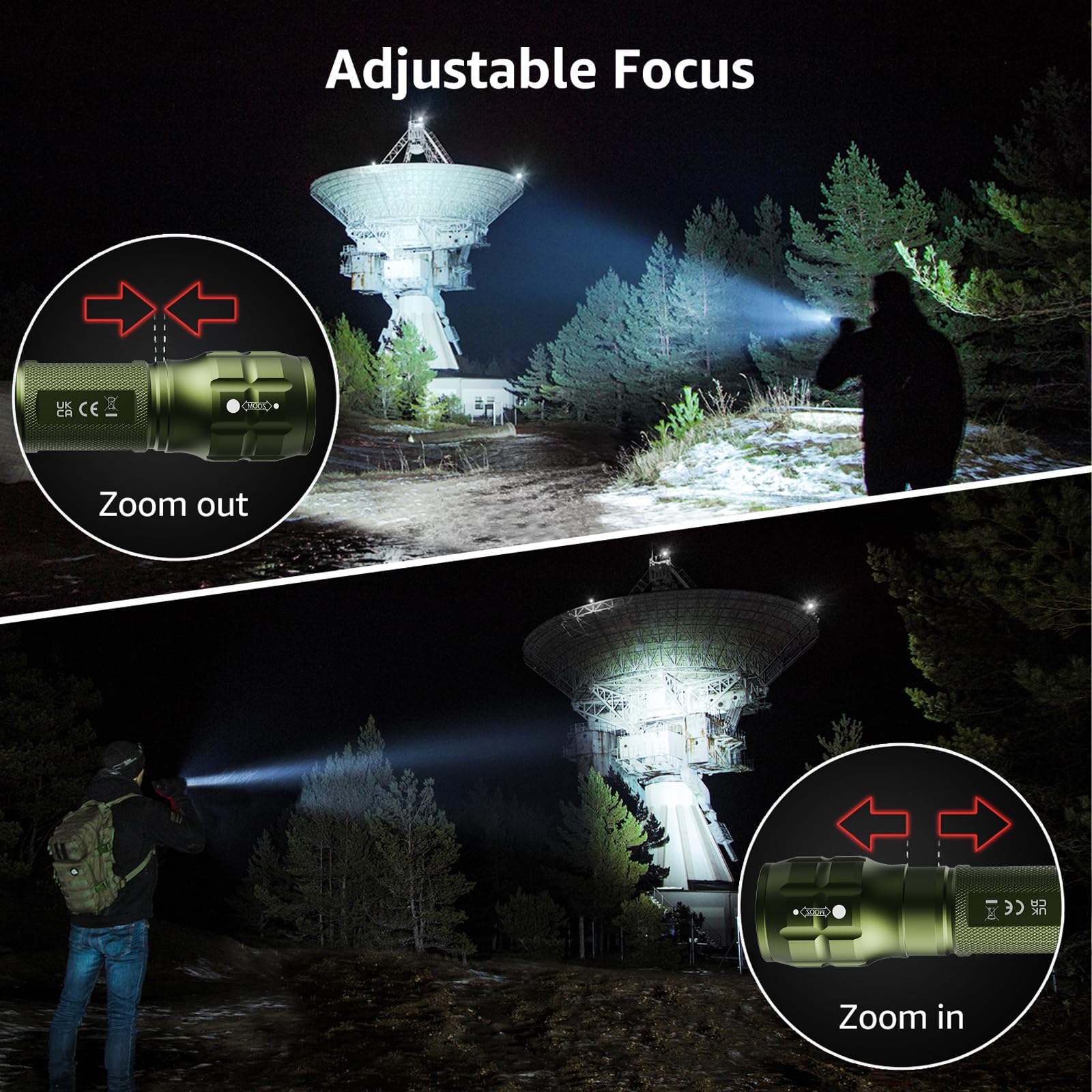 ZOOMABLE FLASHLIGHT- Led flashlight has ability to narrow or widen the area you wish to light. You can stretch the head-pulling zoom to adjust its focus and get spot beam or flood beam you need.