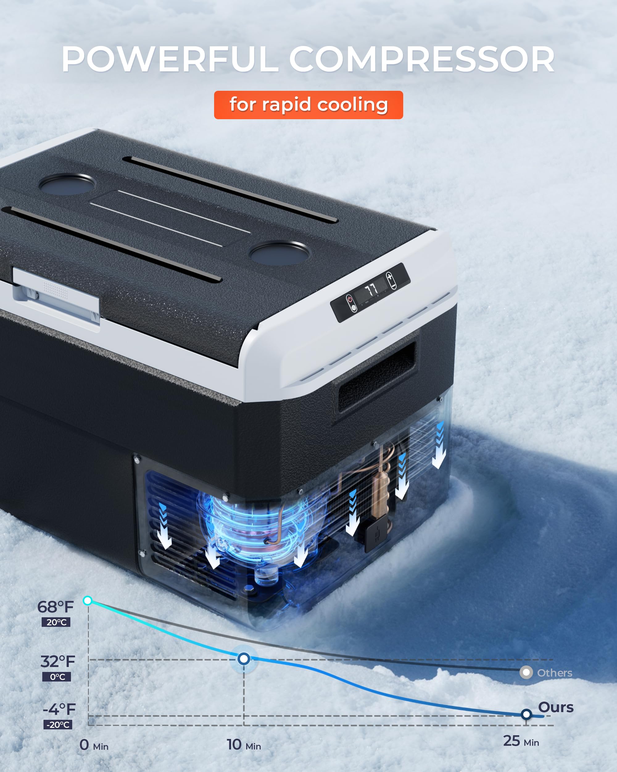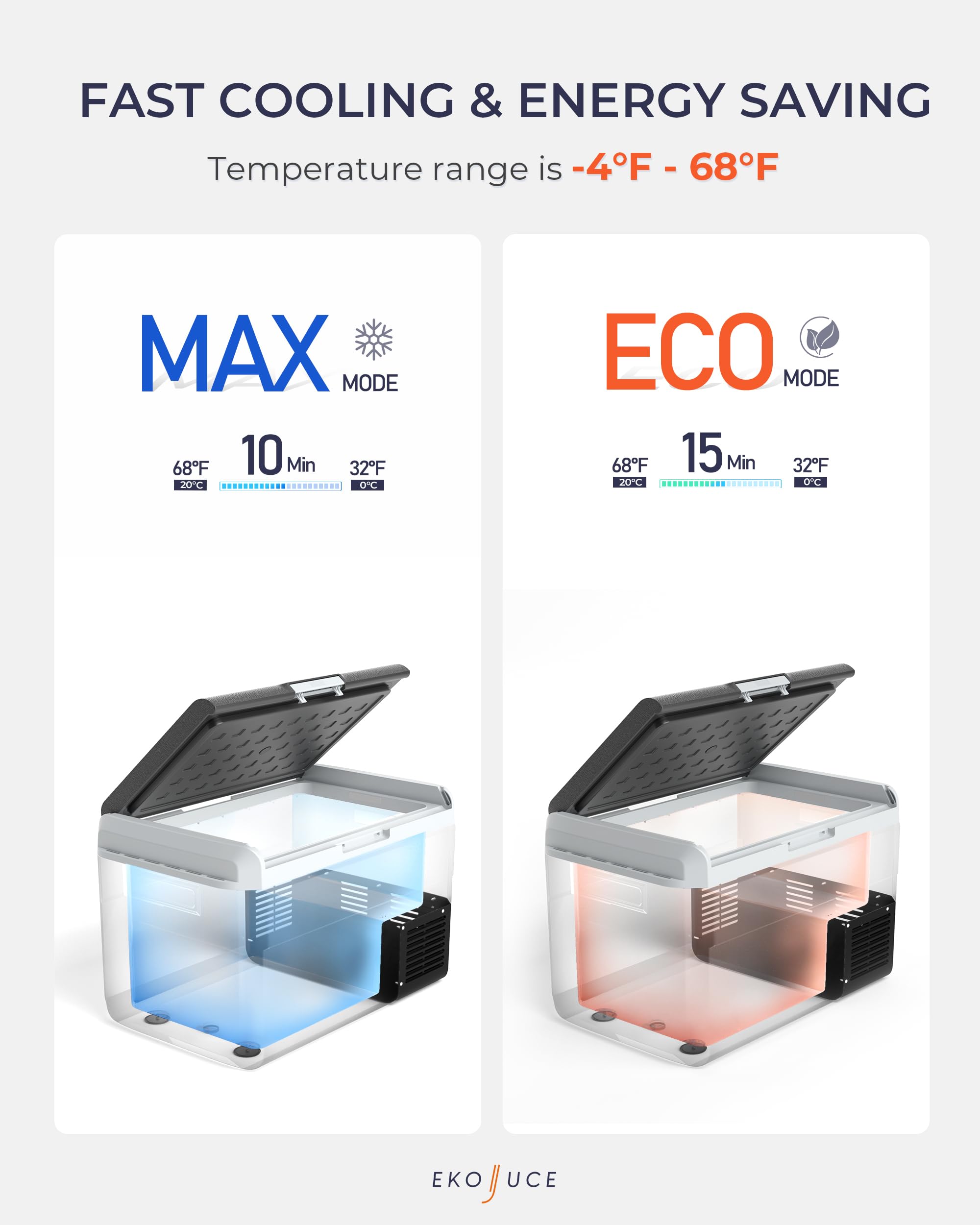 Rapid Cooling & ECO/MAX: Equipped with a high-performance compressor, this 12 volt car refrigerator can rapidly cool to your desired temperature in just 15 minutes on MAX mode. The ECO mode helps minimize energy consumption, ensuring your portable refrigerator operates efficiently during long trips