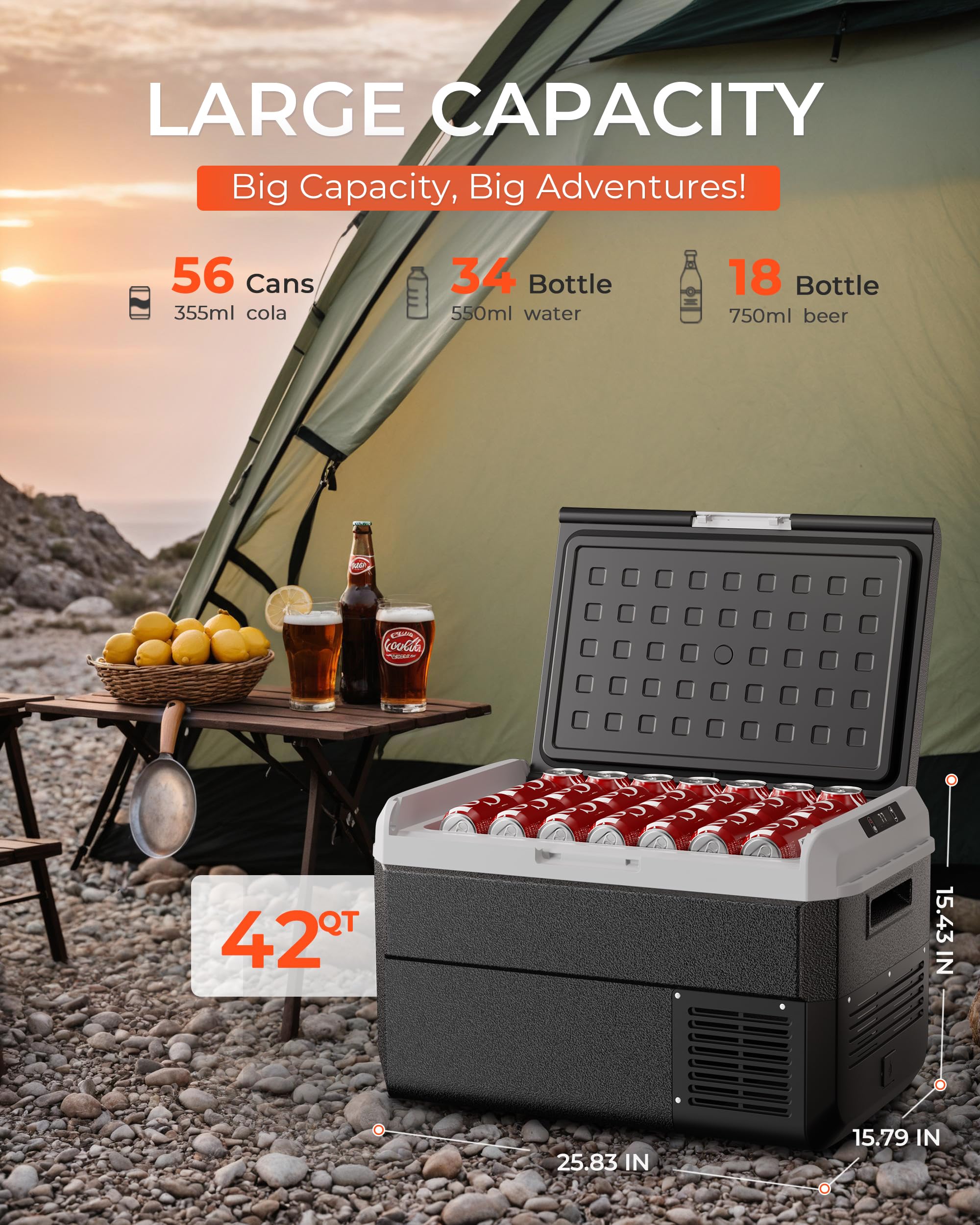LCD Display & Low Noise: The 12V fridge features an LCD control panel for easy temperature adjustments from -4°F to 68°F, along with Bluetooth app control for added convenience. Operating at a quiet 45 decibels, this 12V car fridge is designed to be shock-resistant, ensuring your food and drinks remain cool without disturbing your travel experience