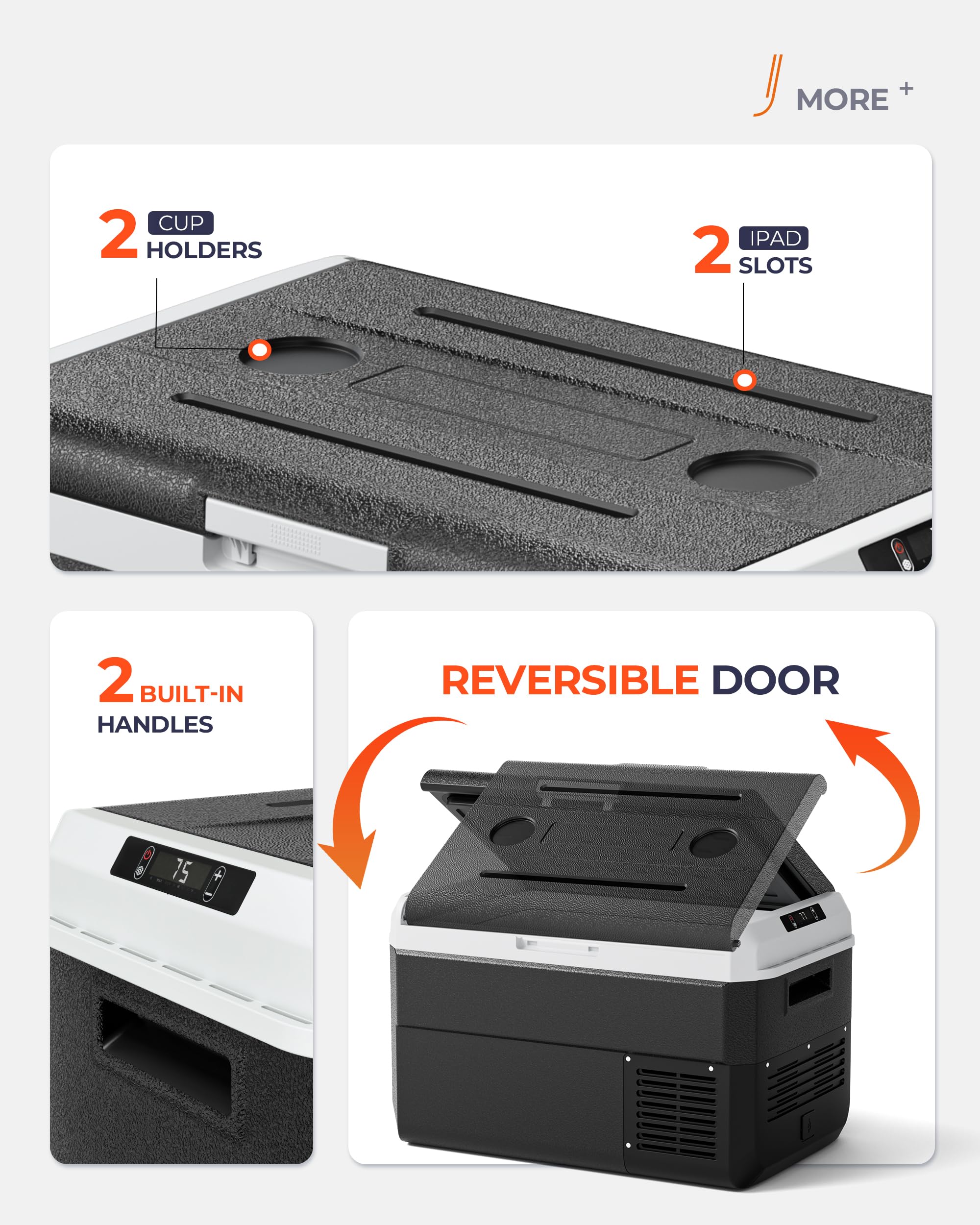 Large Capacity & Functional Design: The EKOJUCE Portable Car Refrigerator offers generous storage space to keep your food and beverages fresh while on the road. This portable freezer features two electronic device slots and cup holders, making it a convenient choice for trucks, RVs, off-road vehicles, campers, vans, and boats