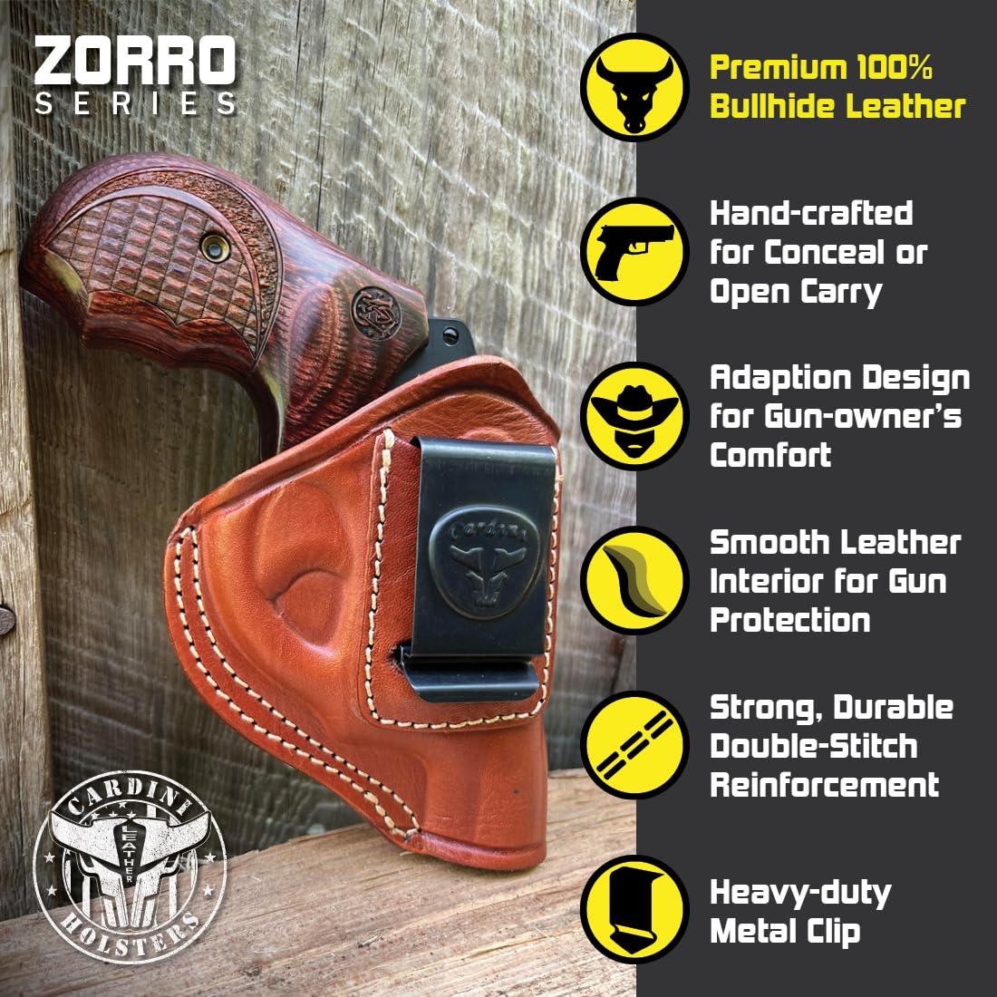 [Key features] Sweat shield to protect your revolver from moisture and body from chafing | Versatile metal clip ensures a secure grip on the waistband or belt, and can be worn on the hip, back, or appendix carry positions | Tanned with natural, biodegradable vegetable dyes to protect your health, firearm, and the environment | Level 1 retention for the fastest, unobstructed draw!