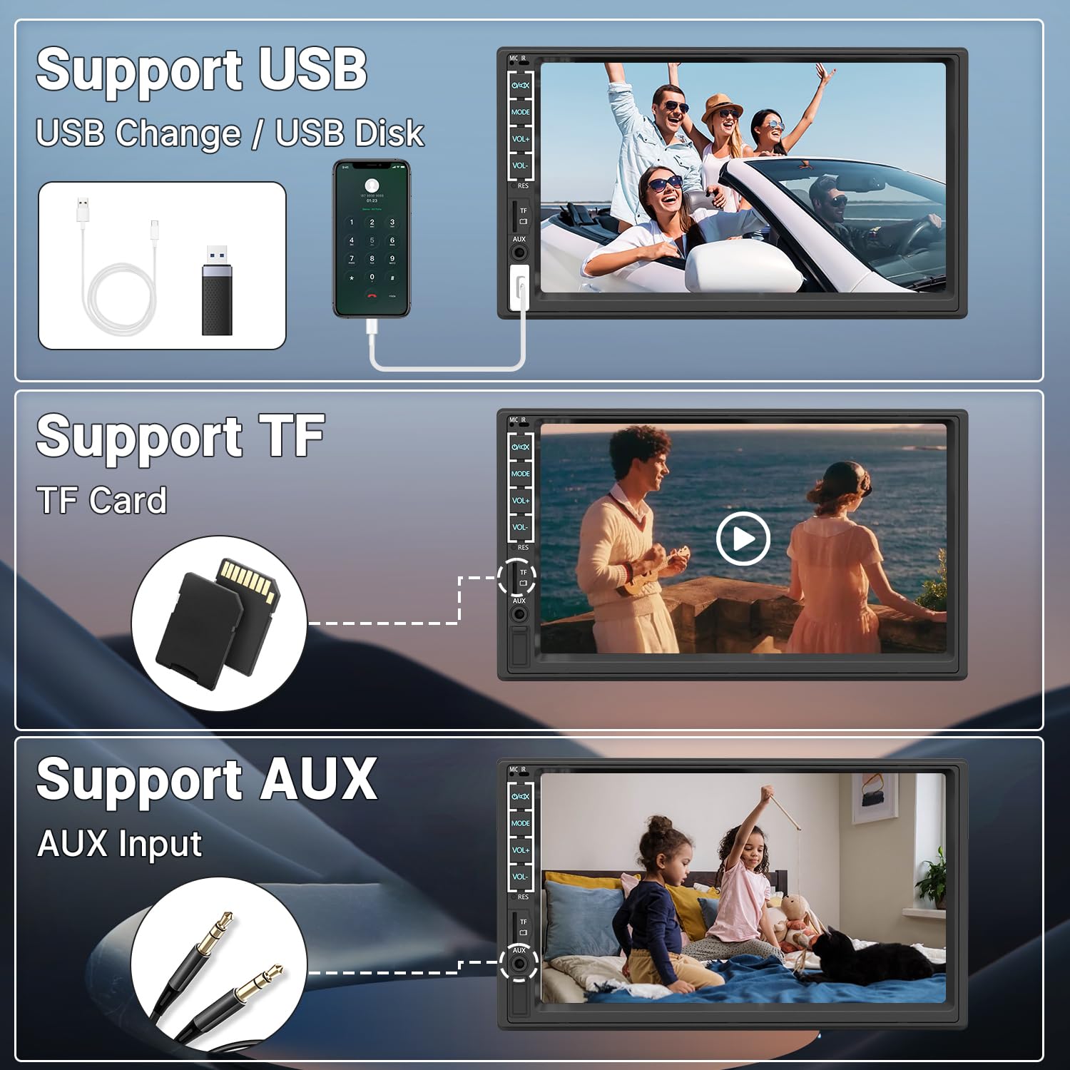 【HD Capacitive Touchscreen & Mirror Link】7 inch touchscreen car aduio receivers equipped with high definition capacitive touch screen, supporting 1920x1080P video, enhance your visual experience. You can put the mobile phone apps on the HD display via the mirror link that you could realize control between your phone and car stereo with apple carplay. Note: the 2 din car stereo mp5 player is not a GPS unit, it gets GPS navigation function by connecting to the cellphone.