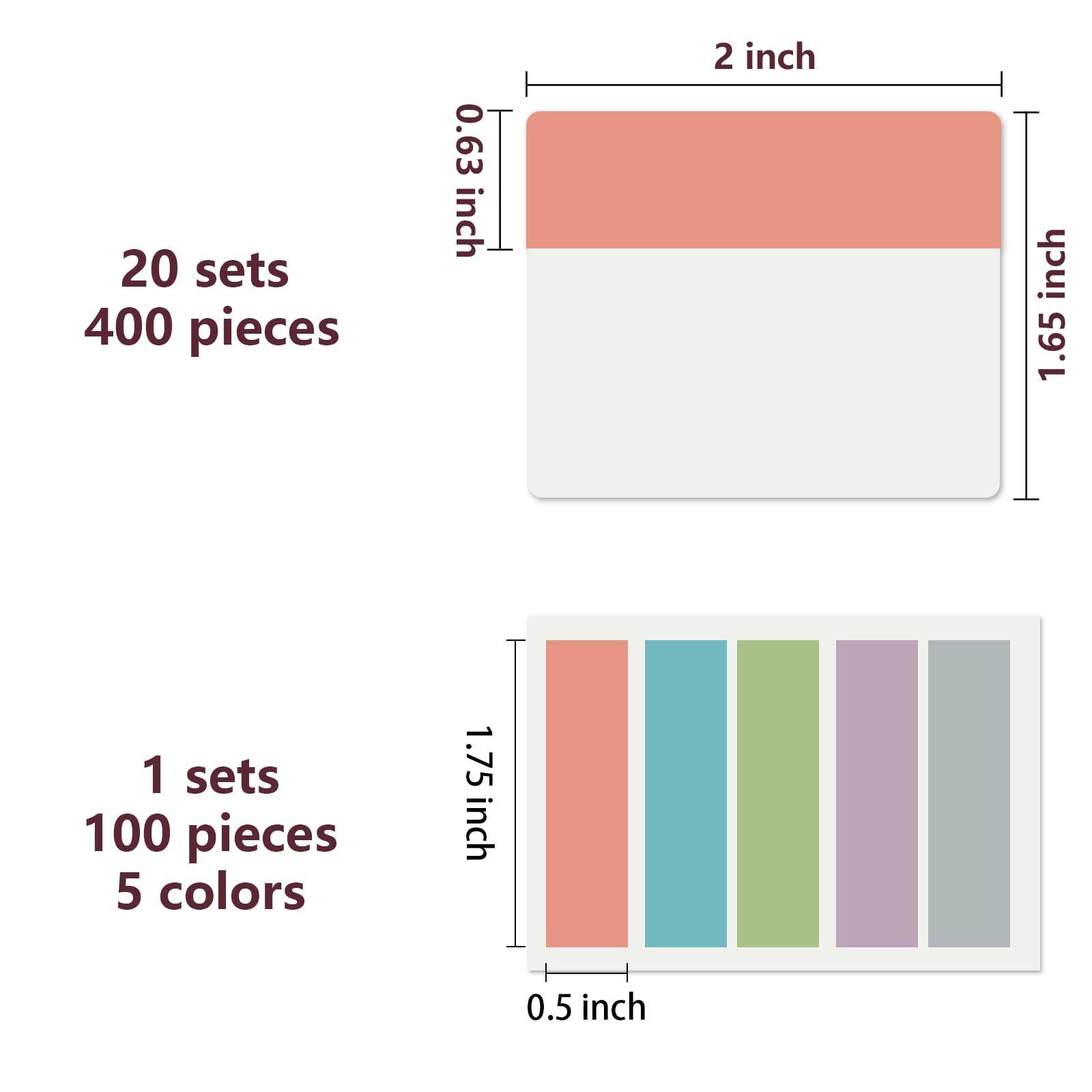500 pieces Book Tabs: 500 pieces 21 sets in total, 400 pieces 2 inch sticky tabs in 20 sets with 10 different pastle colors,100 pieces 0.5 in tabs in 1sets, 20 pieces each color