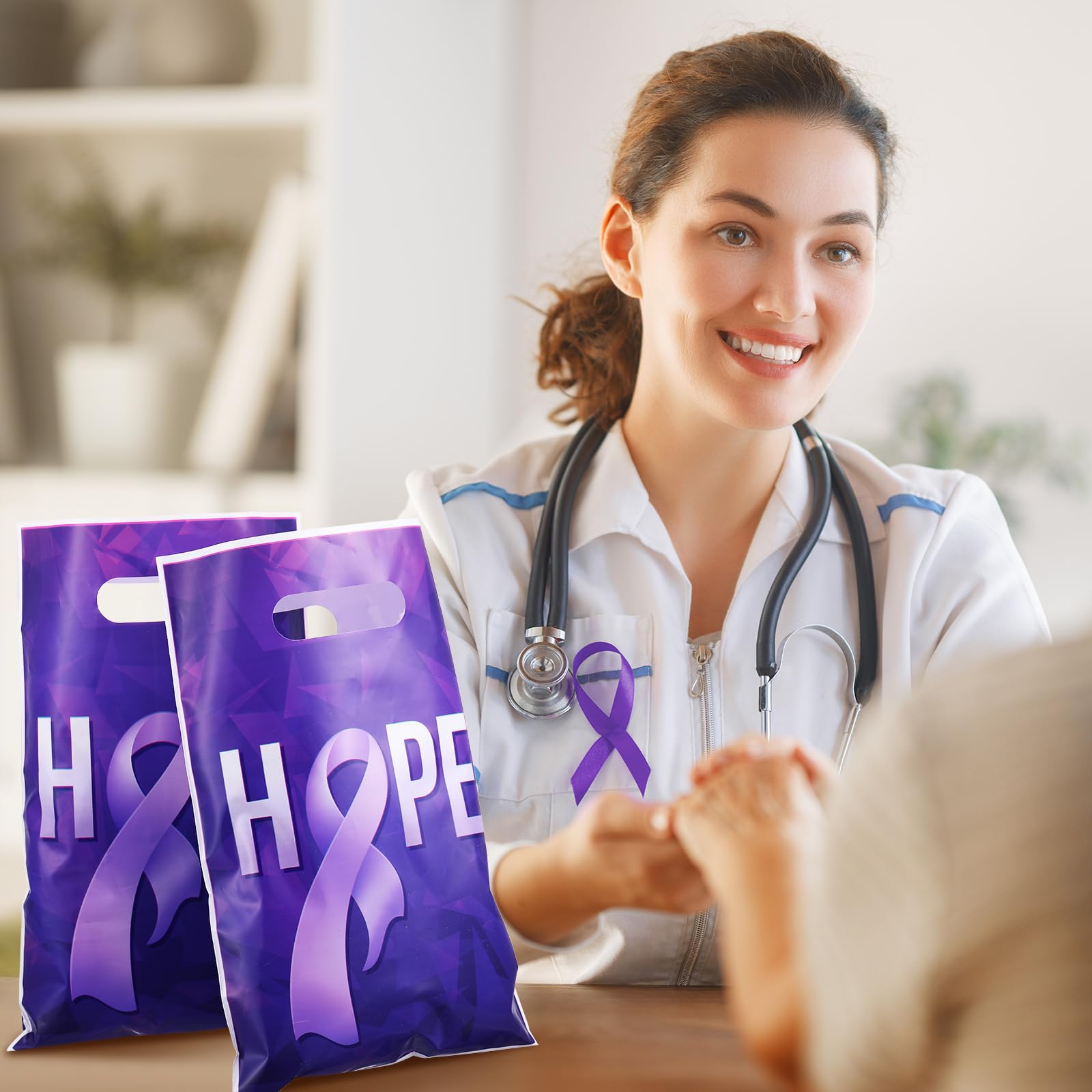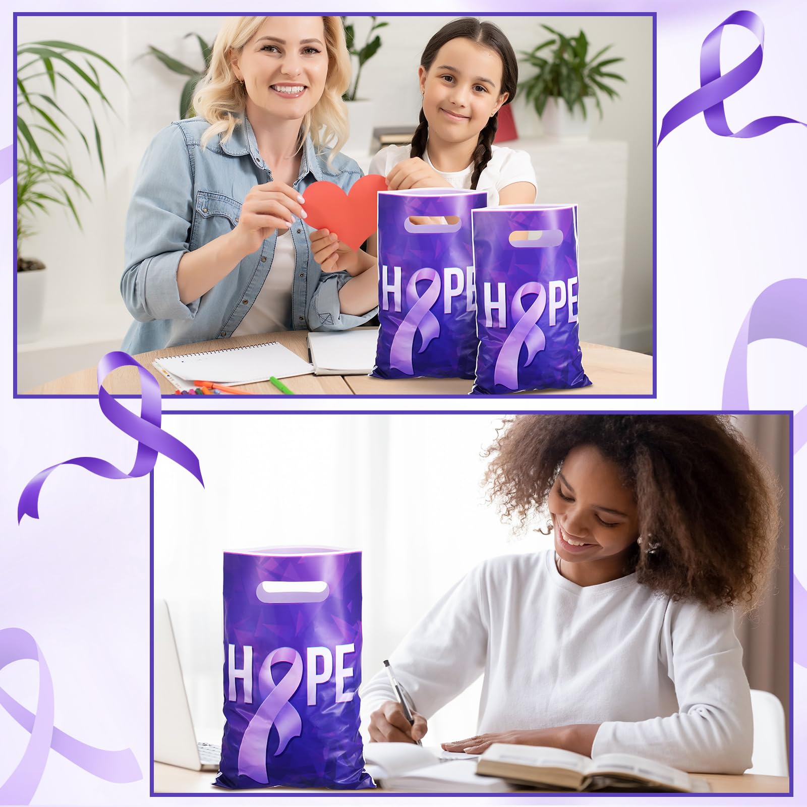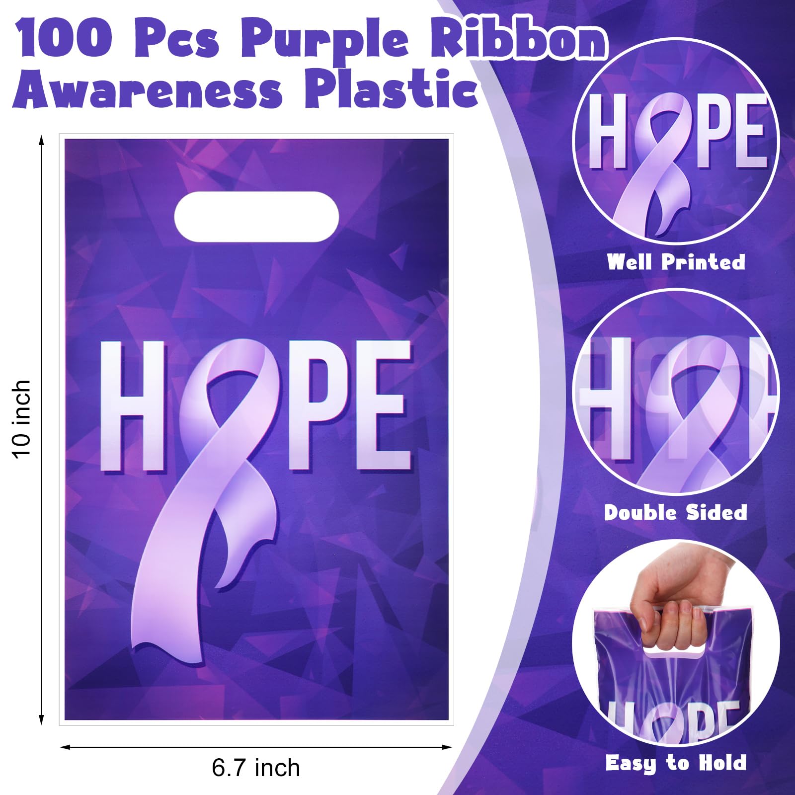 100 Pcs Bags with Handle Design: you'll get 100 pcs purple ribbon awareness plastic goody bags with handles, which makes it convenient and portable to carry with, sufficient quantities to meet your more using needs, you can also share with family and friends, ideal for Campaign Support and daily use