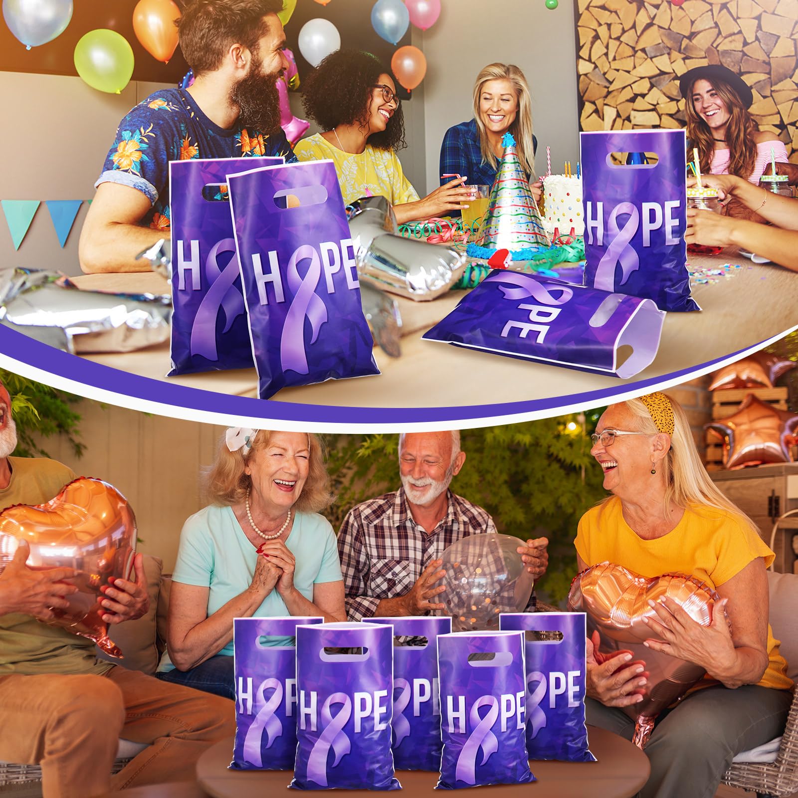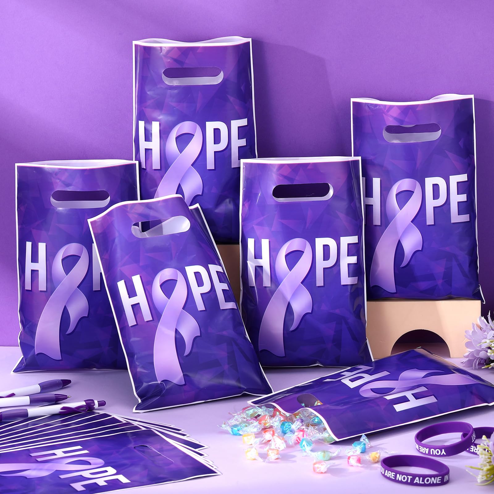 Raise Awareness and Show Support: designed with purple ribbon shape, these purple ribbon plastic bags are sure to strengthen the support systems, a symbol of peace, courage, survival, honor, and support for Domestic Violence, Alzheimer's, Epilepsy, Pancreatic Cancer and other purple ribbon causes