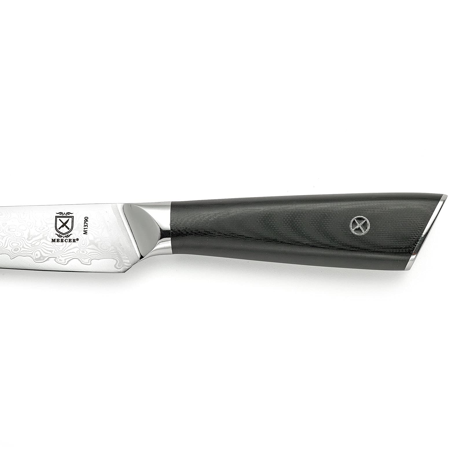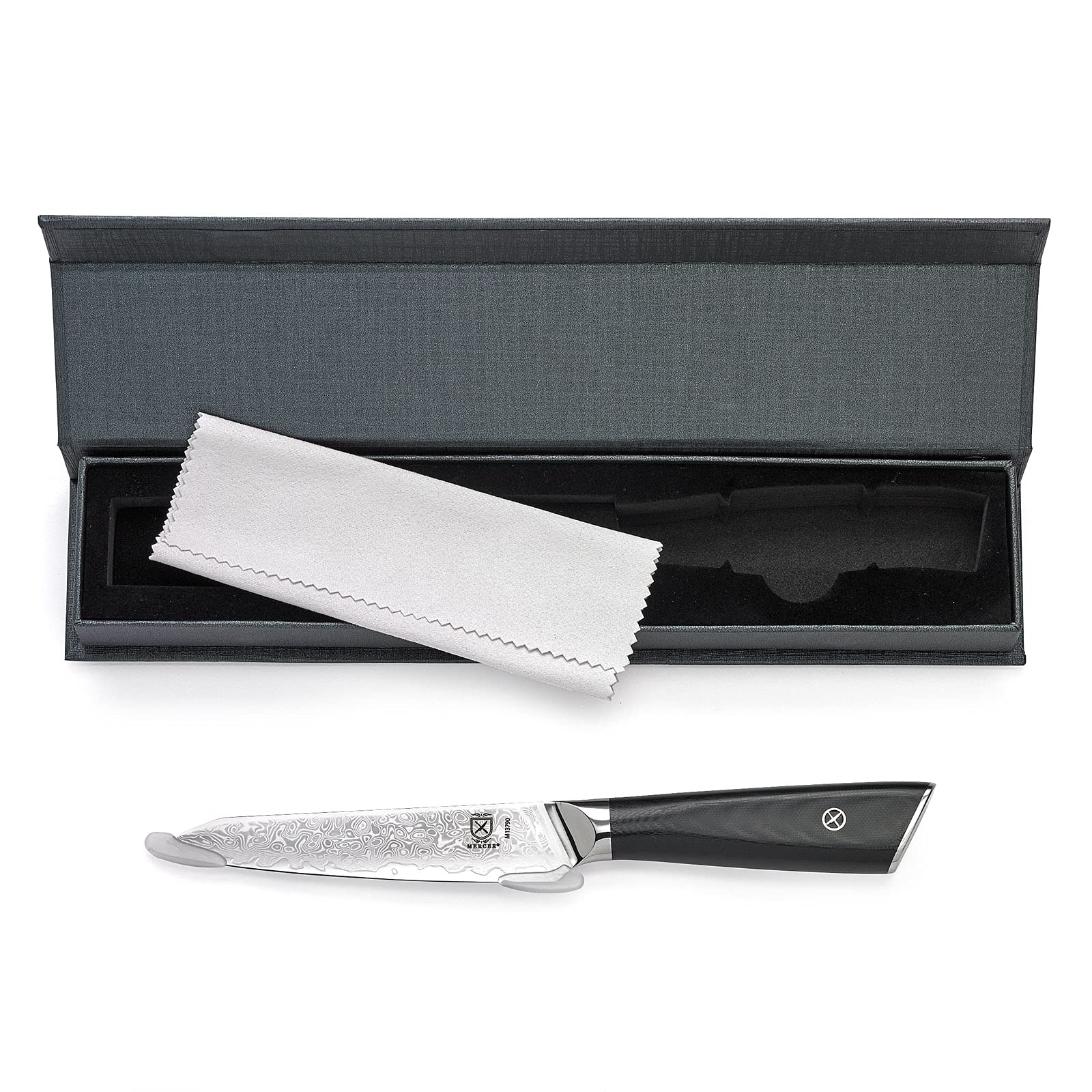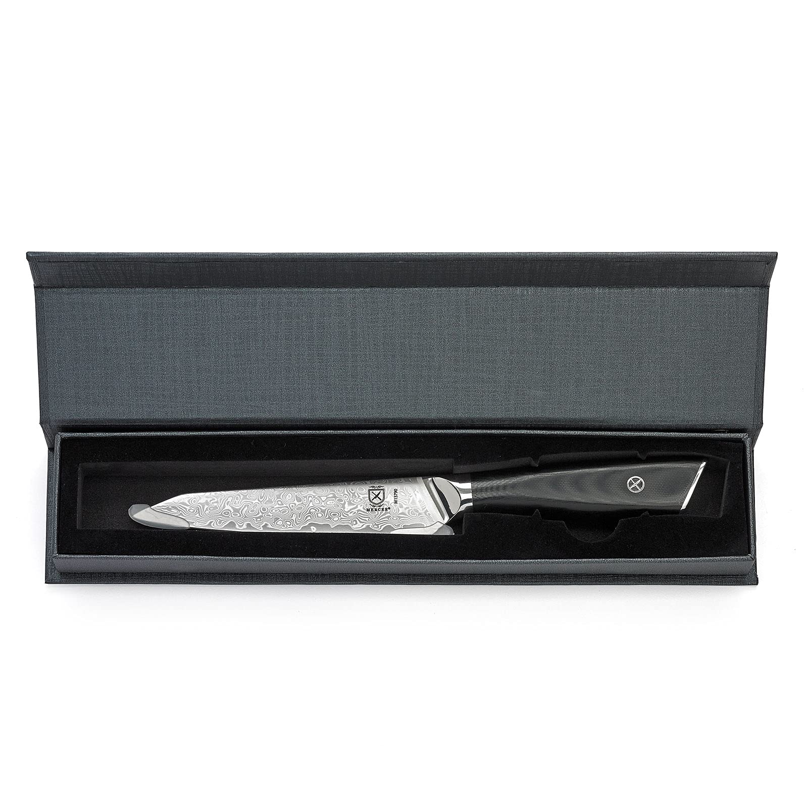 Beautiful Damascus styling clad stainless steel that protects core while maintaining a sharp 15-degree edge. Razor sharp with Rockwell Hardness of 62. Premium ergonomic G10 handle for durability and stability. The shape offers superior hand control and comfort. 1% Carbon, 15% Chromium, 1% Molybdenum, 0.2% Vanadium, and 1.5% Cobalt. Wash by hand and dry with a clean towel after use. Limited Lifetime Warranty.