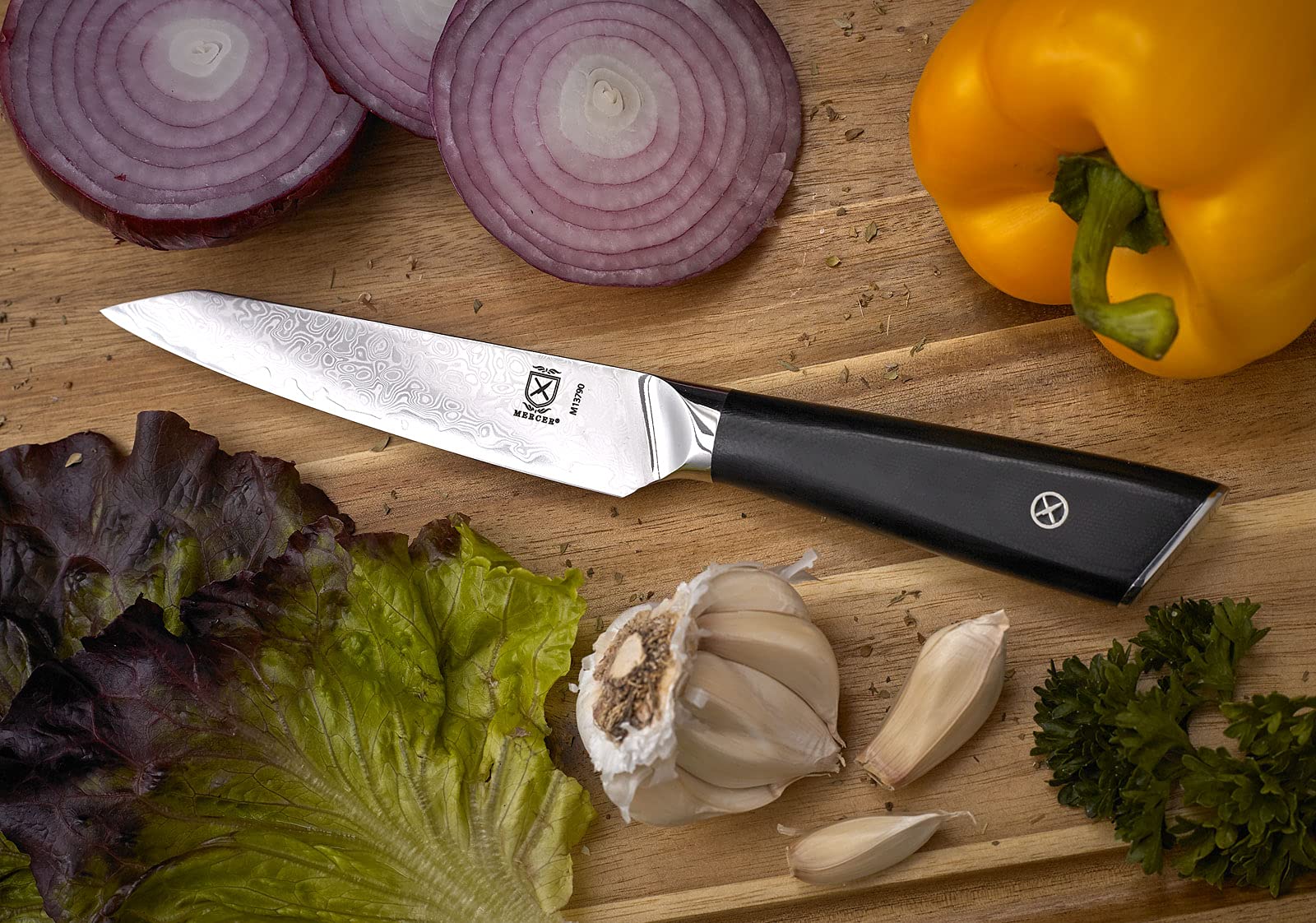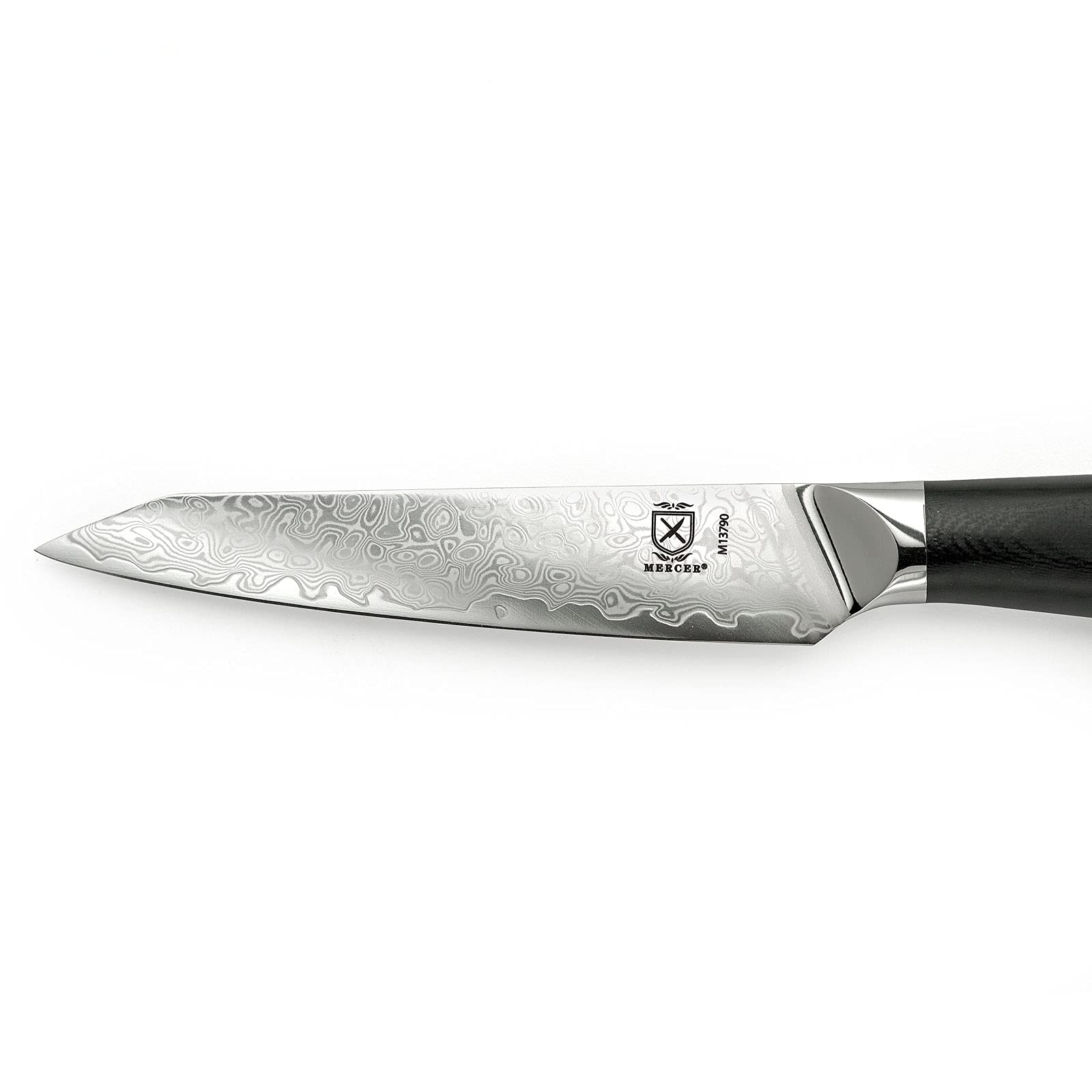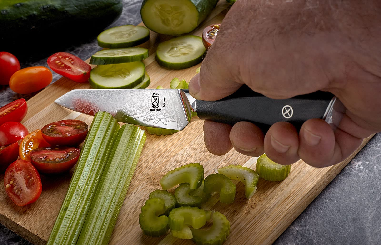 Beautiful Damascus styling clad stainless steel that protects core while maintaining a sharp 15-degree edge. Razor sharp with Rockwell Hardness of 62. Premium ergonomic G10 handle for durability and stability. The shape offers superior hand control and comfort. 1% Carbon, 15% Chromium, 1% Molybdenum, 0.2% Vanadium, and 1.5% Cobalt. Wash by hand and dry with a clean towel after use. Limited Lifetime Warranty.