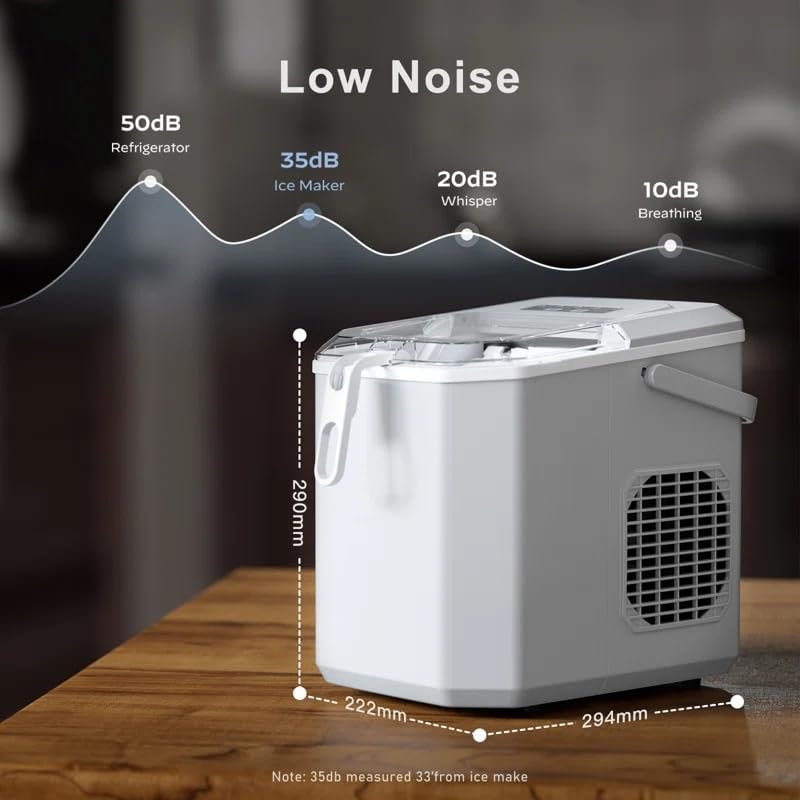 PERFECT COMPACT SIZE: Measuring only 8.7 x 11.4 x 11.6 inches in size, the Silonn ice maker can easily fit on a counter, kitchen island, or desk without taking up too much space. Thanks to the 35db low-noise design, you can run the machine without loud distraction