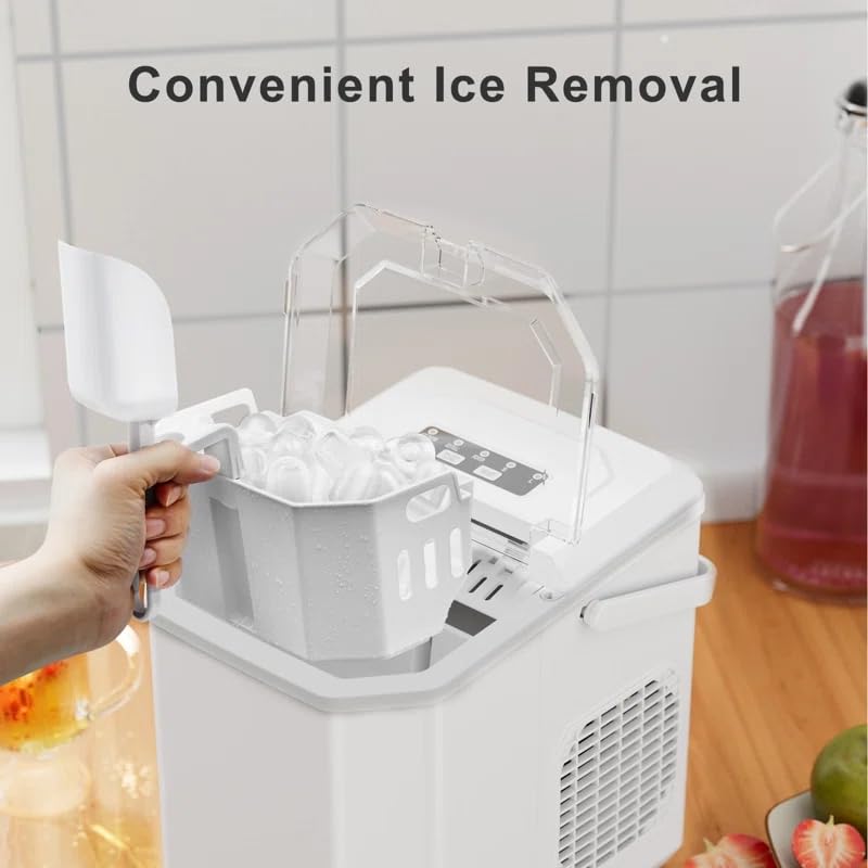 CONVENIENT PORTABLE DESIGN: The sturdy handle makes the ice maker easy to carry, while the scoop attaches to the basket for convenient storage. Weighing just 13.7 lbs, you can take this compact machine room to room or to an event with ease